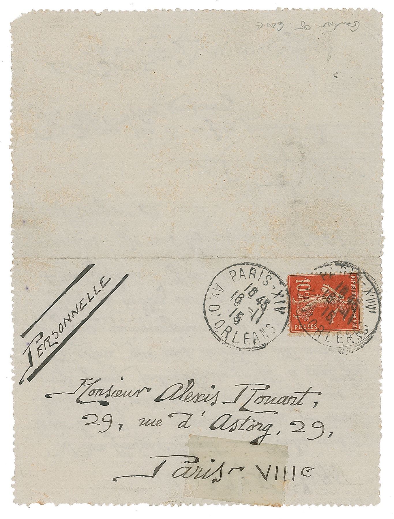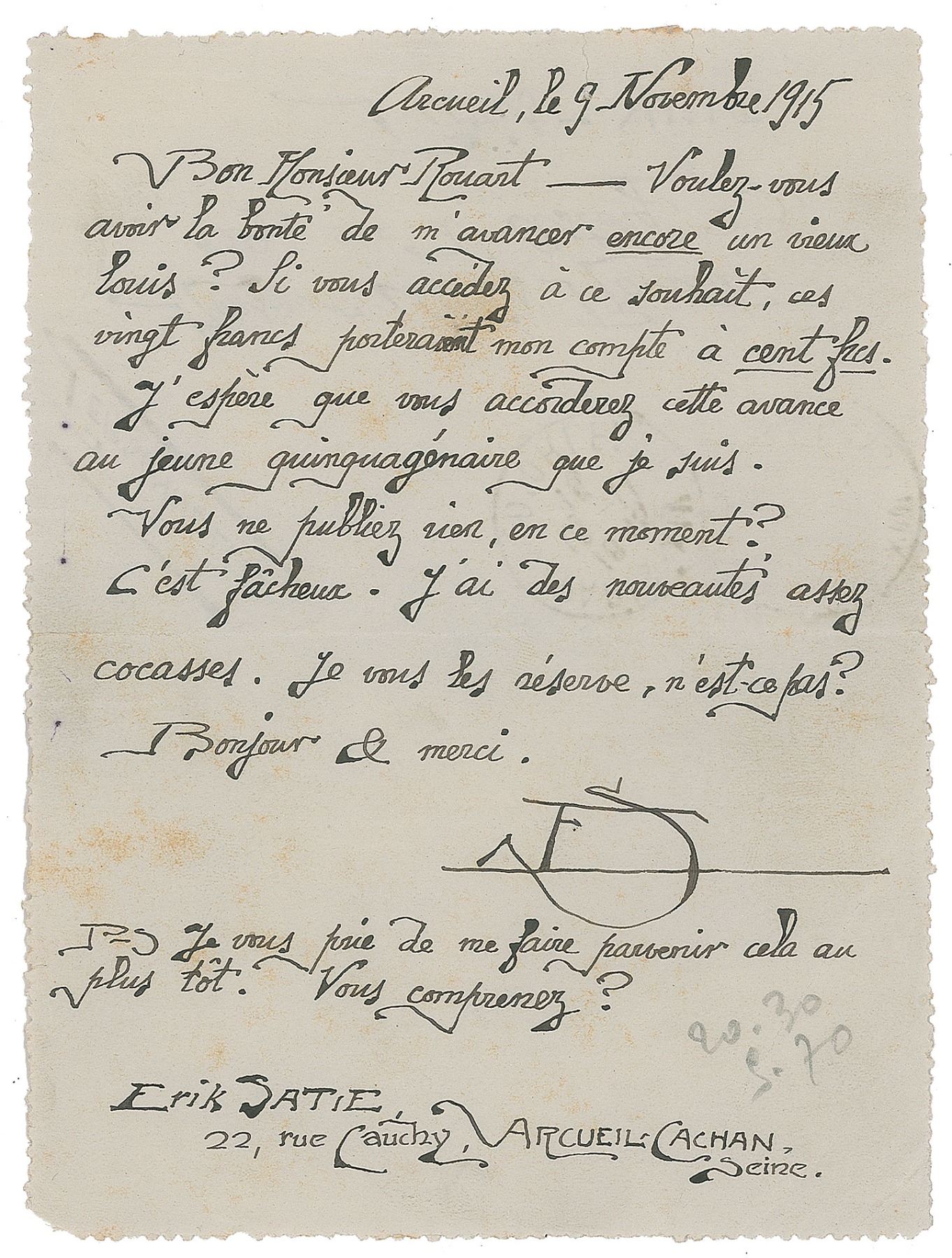 ALS signed “ES,” one page, 4.5 x 6.25, November 9, 1915. Letter to publisher Alexis Rouart, written in an elegant script, playfully requesting a small advance. In part (translated): "Would you have the enormous kindness and advance me one more old Louis? If you can fulfill this desire these 20 francs would take my debt to 100 francs. I hope you will be willing to allow this advance to the young 50-something that I am. You are not publishing anything at this moment. That is sad because I would have some particularly curious novelties to submit to you...P.S. I ask you to please send this the sooner the better. You do understand, don’t you?" Signed at the conclusion with a stylish monogram, "ES," and as part of his return address, "Erik Satie, 22 rue Cauchy, Arcueil-Cachan, Seine." Addressed on the reverse in Satie's hand. In fine condition, with a piece of clear tape on the address panel. A very beautiful, graphically appealing letter from the master modern composer.