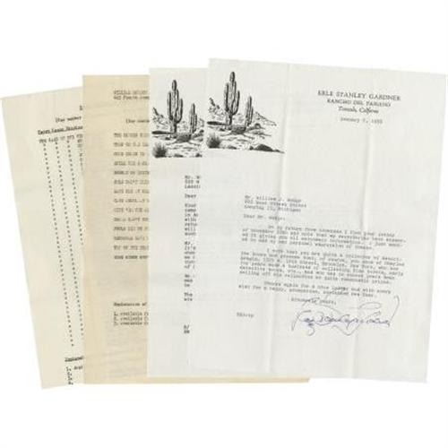<B>Erle Stanley Gardner Typed Letter Signed</B></I> “<I>Erle Stanley Gardner</B></I>”. One page, 8.5” x 11”, on Gardner's personal letterhead, Temecula, California, January 2, 1955, to William Wedge, Lansing, Michigan, with original mailing envelope. The author of the <I>Perry Mason</B></I> series responds to Wedge thanking him for his support and recommending a collector of mystery novels in New York that he might like to contact. Gardner has signed the letter in his unique, otherworldly style. Included is another letter from Gardner's secretary, Ruth Moore, on letterhead, dated December 24, 1954, advising Wedge that Gardner would be out of touch until after the first of the year and includes a two page bibliography of Gardner's books. The letters have the usual fold creases, else all are in fine condition. <BR><BR><b>Shipping:</b> Flat Material, Small (<a target="_blank" href="http://www.heritageauctions.com/common/shipping.php">view shipping information</a>)
