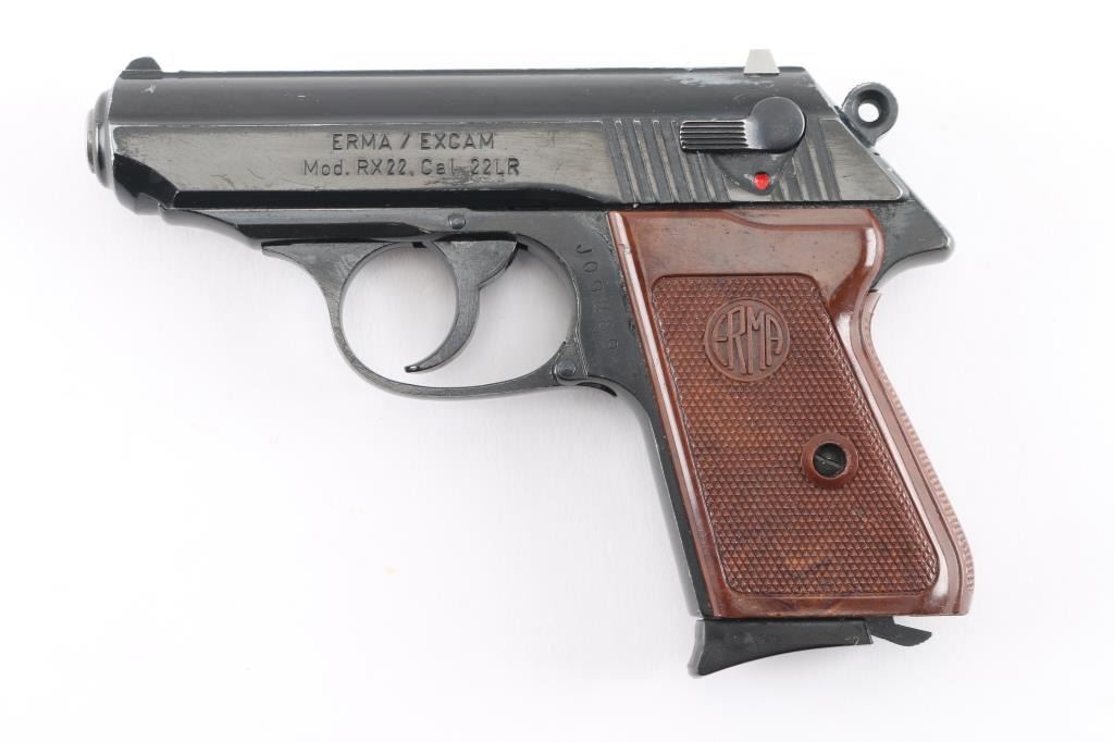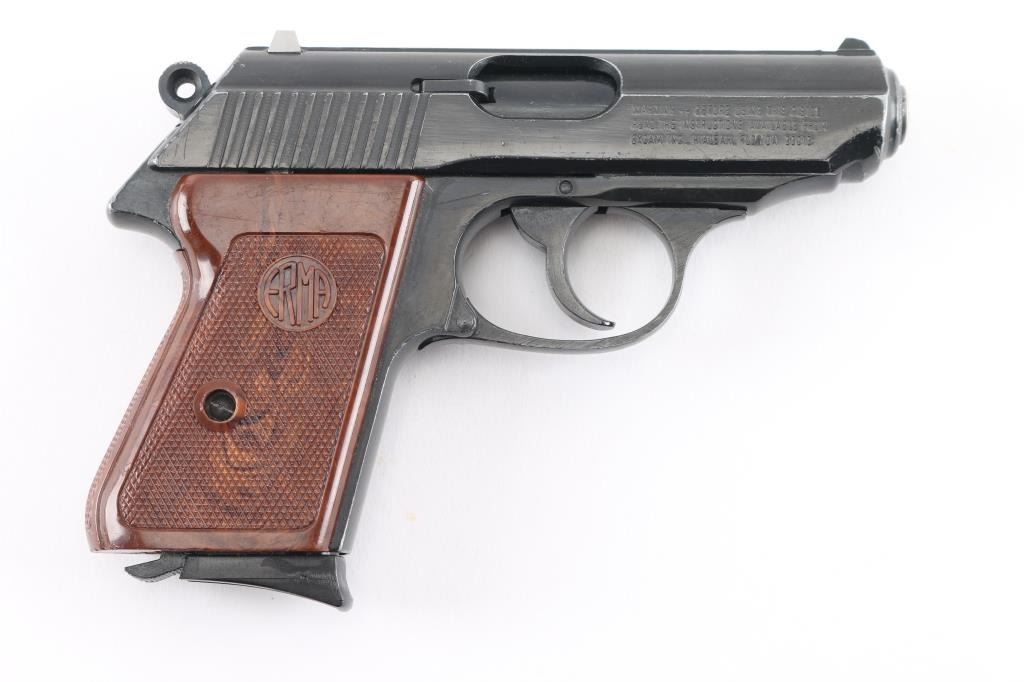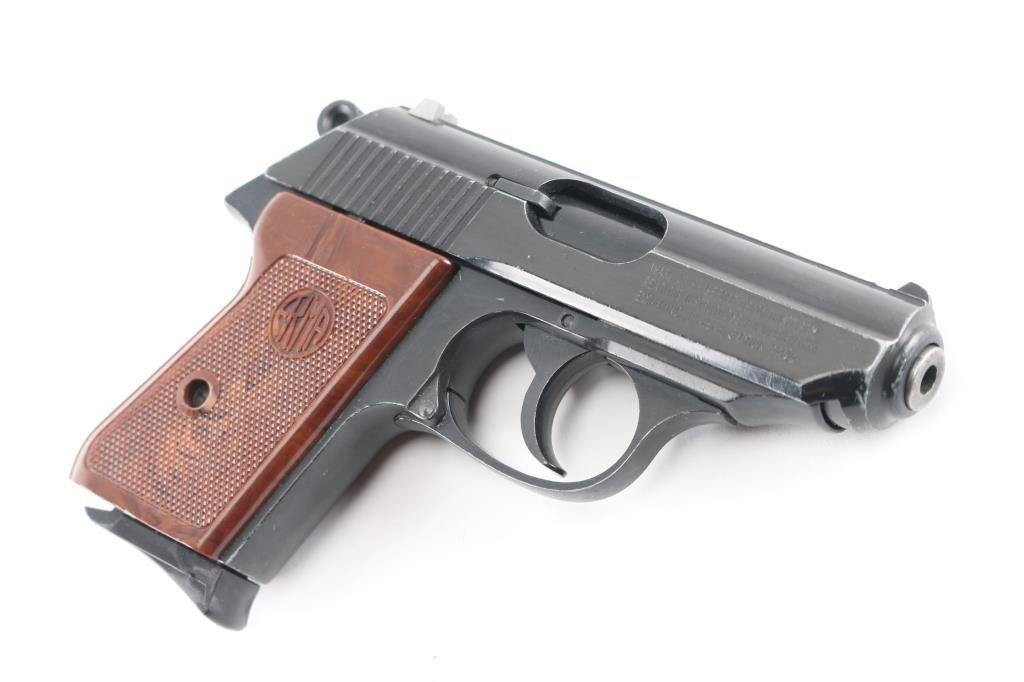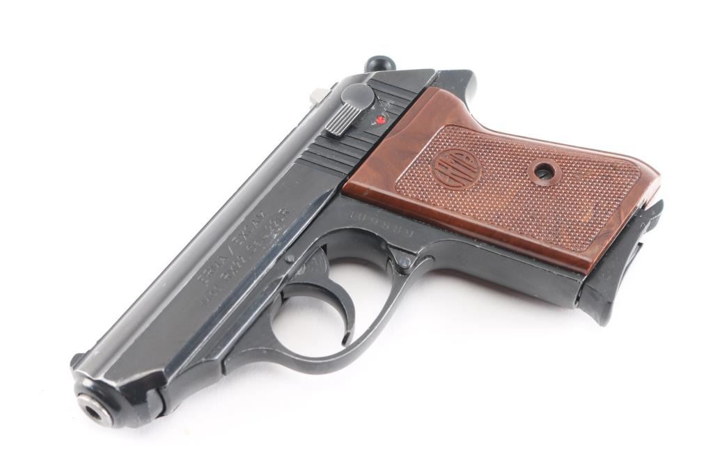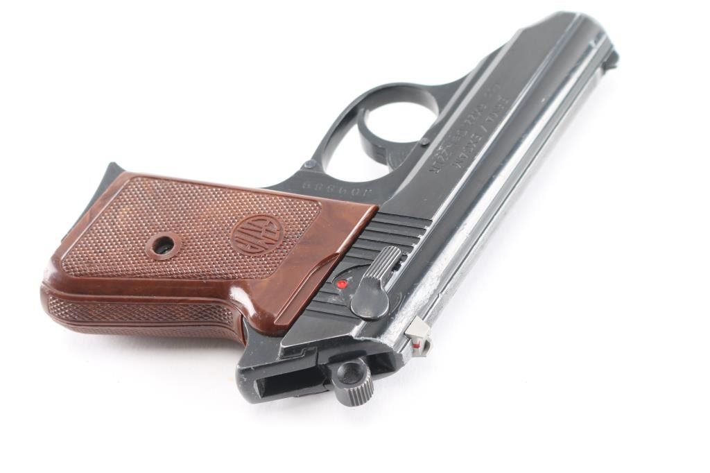 Double action semi-automatic pocket pistol similar in appearance to Walther PPK. Features blued/black finish, 3.25" barrel, fixed sights, slide mounted manual safety, smooth trigger, serrated round hammer spur and two-piece checkered brown plastic grips. Bore is very good condition. Retains 80% finish with edge losses throughout, some scratches, small gray color areas of bare metal on top of slide, handling marks. Rear sight is a replacement, gray color metal with small red dot below notch. Grips are very good. Includes (1) magazine.