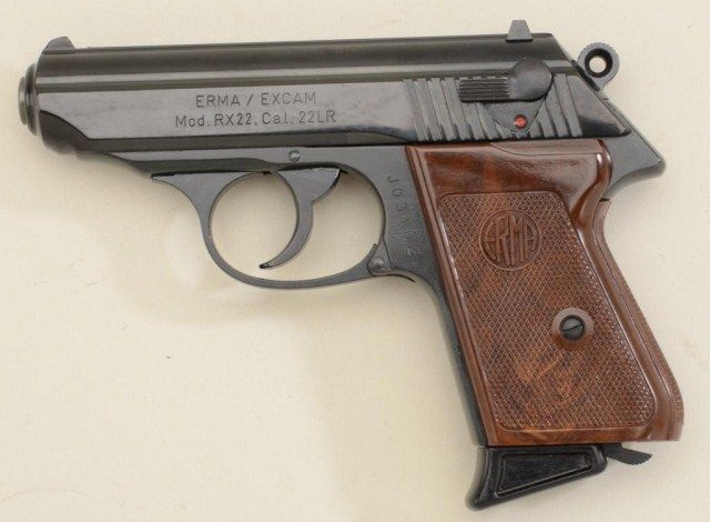 Erma/EXcam Model RX22 DA semi-auto pistol in design of the Walther PPK, .22LR cal., blue finish, brown checkered plastic grips, #J03102 in factory cardboard box with extra magazine in overall excellent conditionshowing little use or handling. Est.: $125-$250.