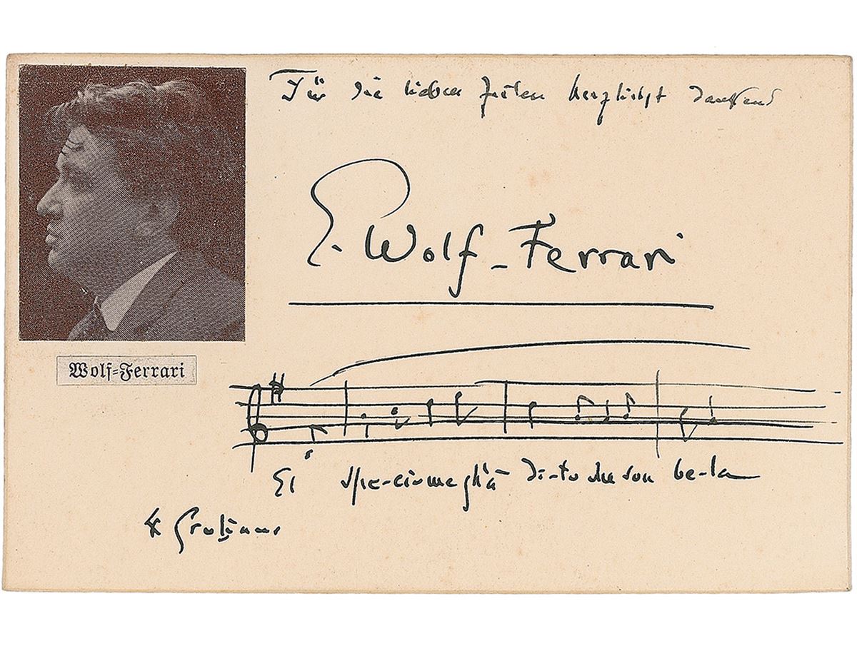 Italian composer and teacher (1876–1948) best known for his comic operas. AMQS on an off-white 3.75 x 2.5 card bearing a small affixed magazine photo, inscribed at the top in German and nicely signed in black ink, “E. Wolf-Ferrari.” Wolf-Ferrari pens four bars of music and lyrics. In fine condition.