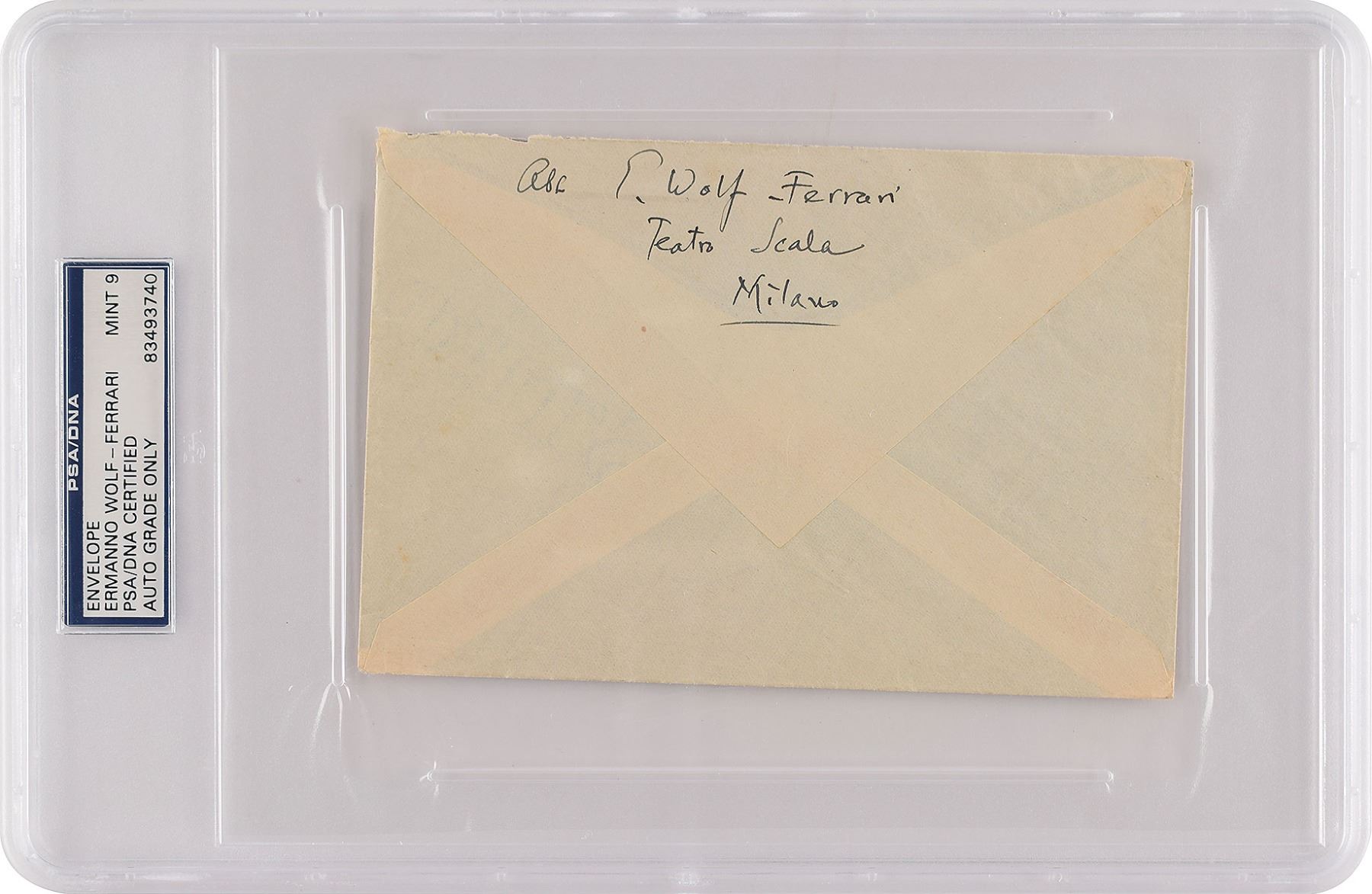 Hand-addressed mailing enveloped, 6 x 4, addressed in Wolf-Ferrari's hand to "Herrn Bruno von Niessen" at the Reichstheaterkammer in Berlin, and signed on the flap as part of the return address, "E. Wolf Ferrari, Teatro Scala, Milano." In fine condition. Bruno von Niessen was a German musician and opera director. Encapsulated and graded by PSA/DNA as "MINT 9."
