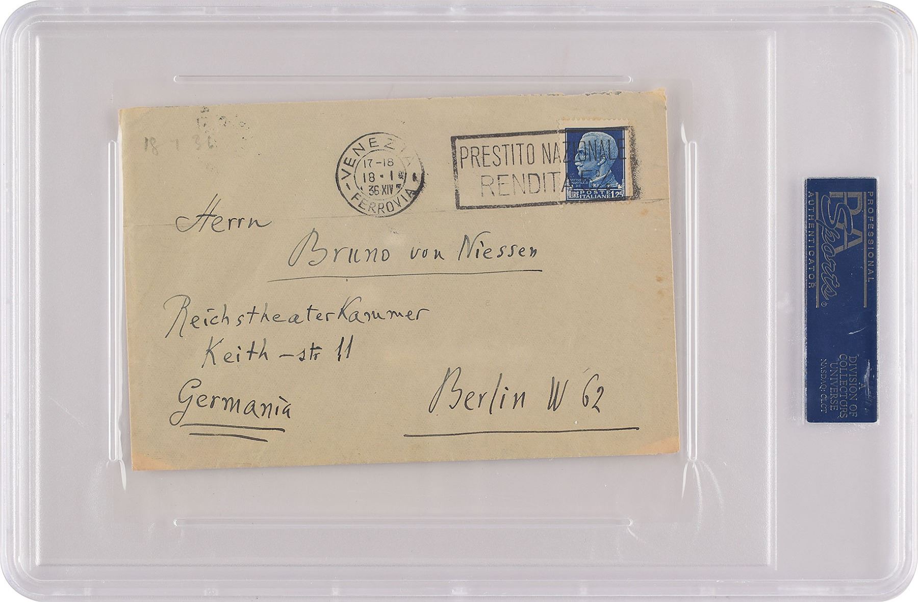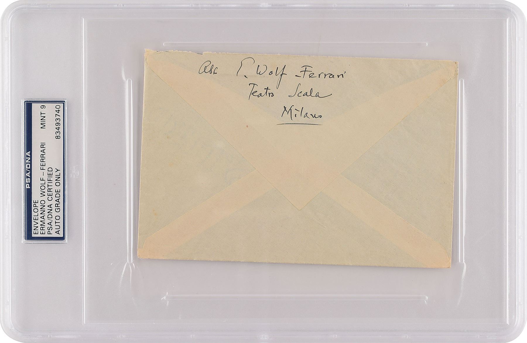 Hand-addressed mailing envelope, 6 x 4, addressed in Wolf-Ferrari's hand to "Herrn Bruno von Niessen" at the Reichstheaterkammer in Berlin, and signed on the flap as part of the return address, "E. Wolf Ferrari, Teatro Scala, Milano." In fine condition. Bruno von Niessen was a German musician and opera director. Encapsulated and graded by PSA/DNA as "MINT 9."