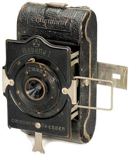 Bobette I (22 x 33 mm), 1926 Ernemann, Dresden, zweite und seltenere Version der Bobette I mit Format 22 x 33 mm auf unperforiertem Kinofilm (Vorläufer des Leica-Kleinbildfilms), mit Ernemann Erid 1:8/4 cm, Verschluß 1/25-1/100, Z.