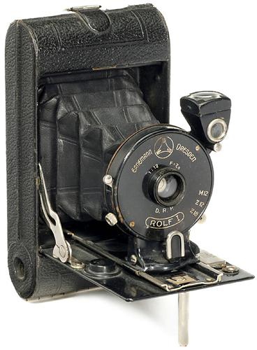 "Rolf I (4,5 x 6)", 1922 Ernemann, Dresden. Rollfilm camera for film 127, unmarked lens 1:12/7,5 cm, automatic shutter M.Z.Z. Rare little Ernemann camera.<Br>
