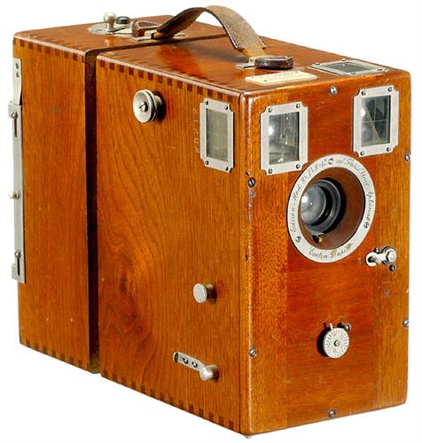 Ernemann: Edelholz-Detektivkamera "Edison Model 95 B", um 1895 Ernemann, Dresden, Platten 9 x 12 cm, spezielle Ausführung, vermutlich für Export nach Frankreich, mit "Paris Univ. Aplanat", Dreiloch-Schiebeblende, regulierbarer Verschluß, Entfernungsanzeige. - Selten!