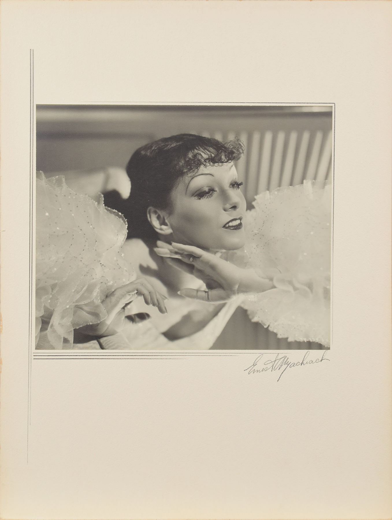 Vintage matte-finish 11.25 x 9.25 Bachrach portrait of Lupe Velez, affixed to the original 15 x 20 studio mount, signed on the mount in pencil by the photographer, "Ernest Bachrach." In very fine condition.