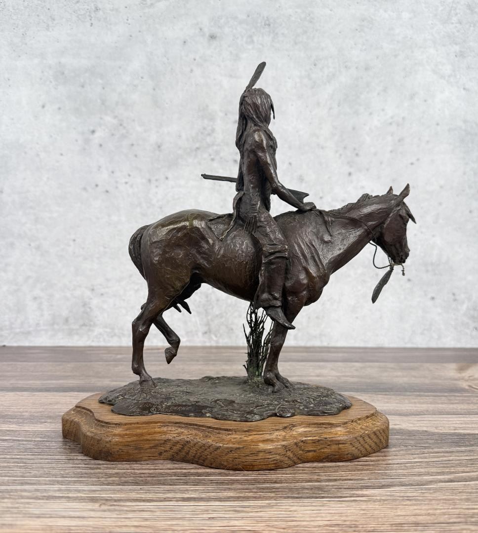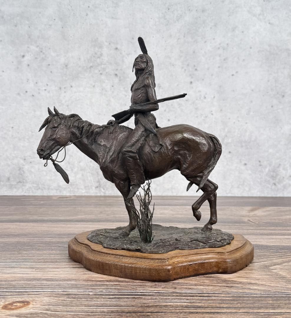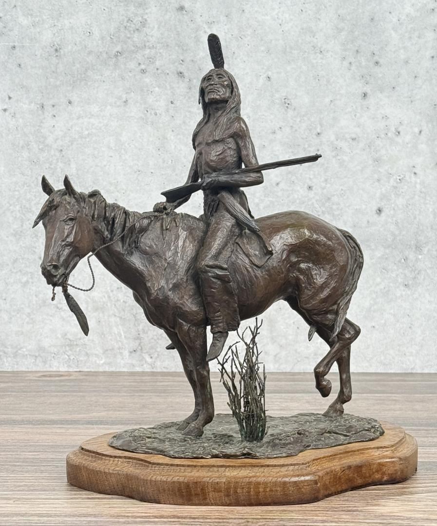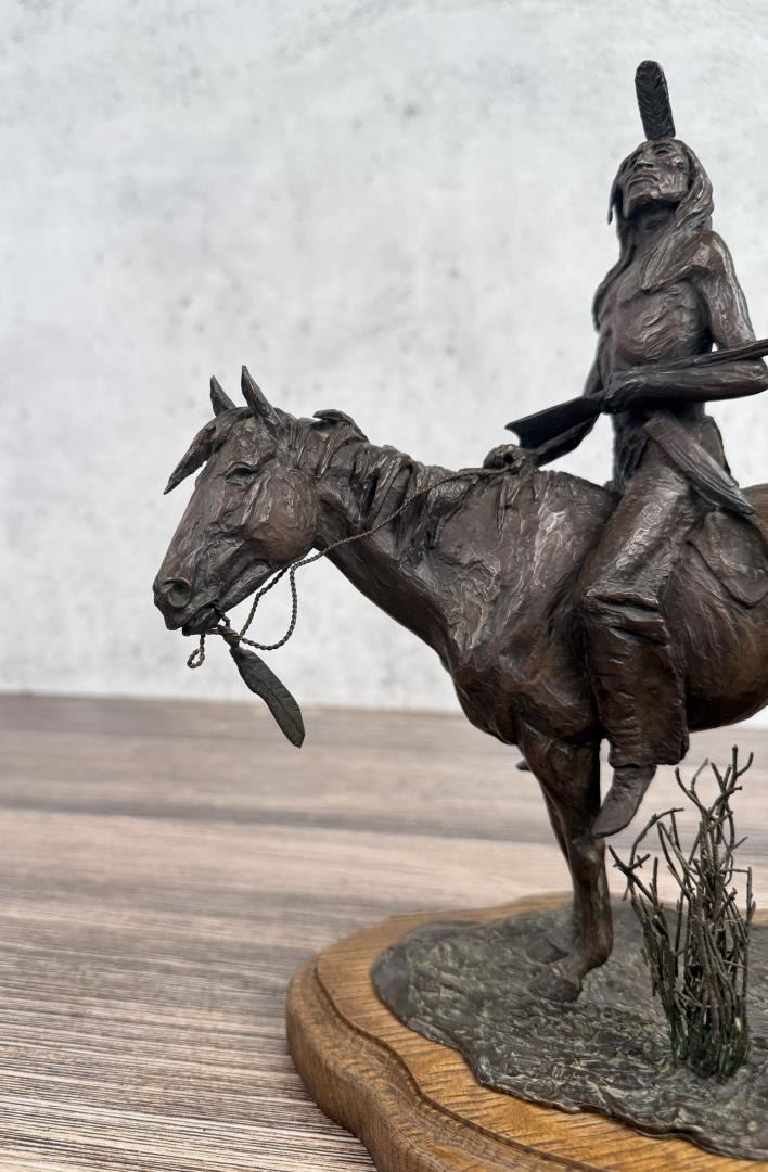Title is Mounted Warrior. 11/25. 11 1/8" by 9 7/8" by 7 1/4". Ernest Berke (1921 - 2010) was active/lived in Arizona. Ernest Berke is known for Western genre-Indian, sculpture. A sculptor and painter of western subjects and well known both in the Southwest and East Coast, Ernest Berke was born in Harlem, New York City in 1921 to a Romanian mother who designed clothes and a Russian father, who was a sheet metal worker. At six years of age, his father, who recognized his talent, encouraged him to pursue art. While working as an advertising illustrator for Sears & Roebuck for a number of years, Ernest became fascinated with the growing West, especially cowboys and Indians. A self-taught artist and anthropologist, Berke was a voracious reader. He met on a regular basis at a local New York City bookstore with a group who shared his interest in the West, and occasionally, Berke would also show his works there. Berke spent his summers in Scottsdale, Arizona, where he erected a 12-foot by 18-foot bronze sculpture titled The Buffalo Hunt. His winters were usually spent in New York City.