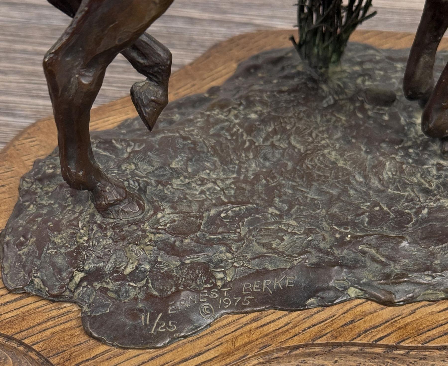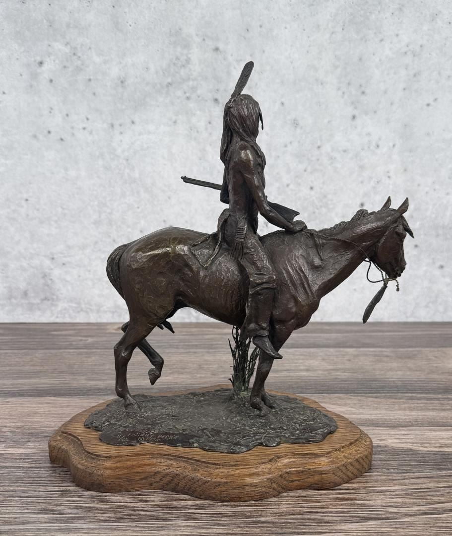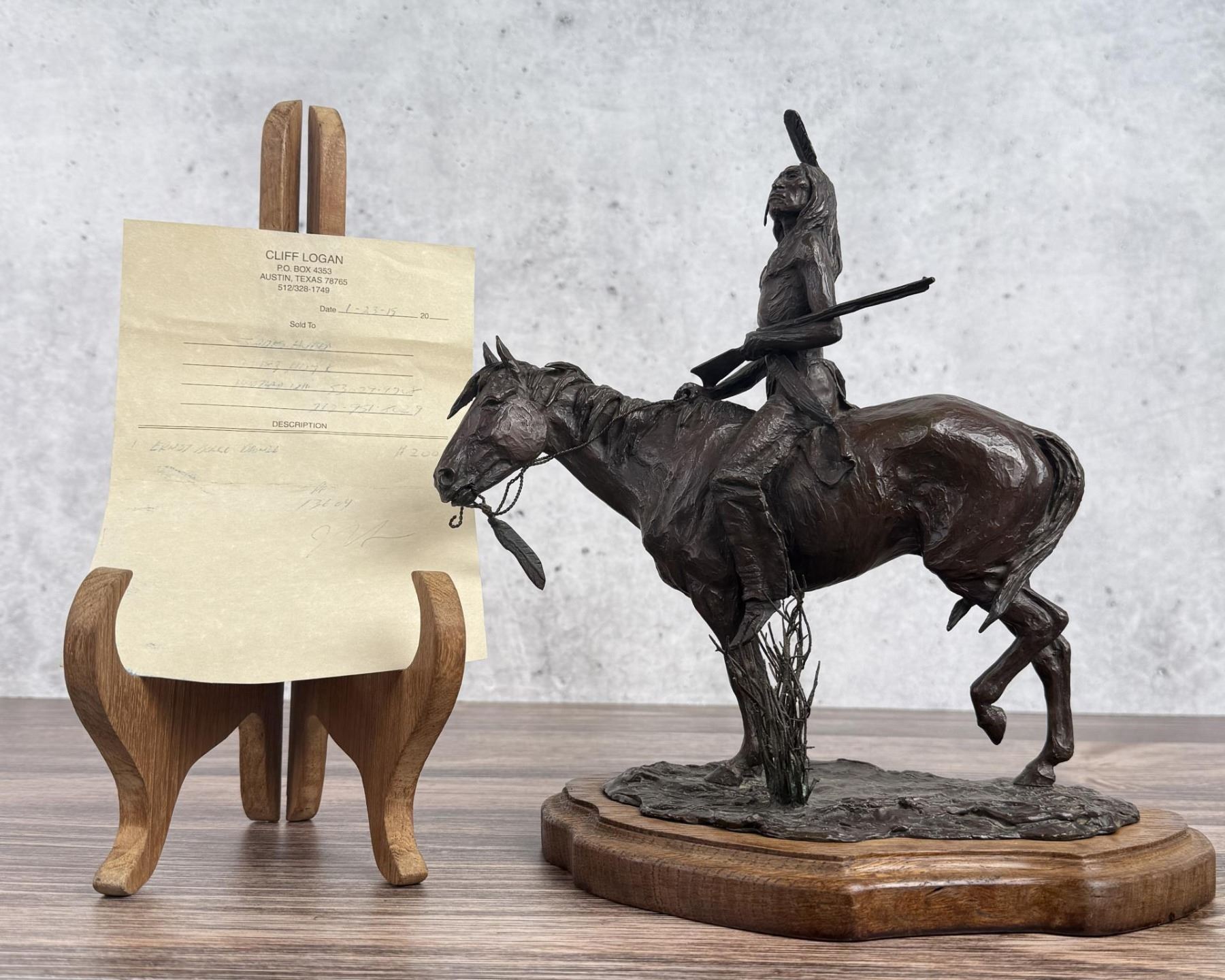 Title is Mounted Warrior. 11/25. 11 1/8" by 9 7/8" by 7 1/4". Ernest Berke (1921 - 2010) was active/lived in Arizona. Ernest Berke is known for Western genre-Indian, sculpture. A sculptor and painter of western subjects and well known both in the Southwest and East Coast, Ernest Berke was born in Harlem, New York City in 1921 to a Romanian mother who designed clothes and a Russian father, who was a sheet metal worker. At six years of age, his father, who recognized his talent, encouraged him to pursue art. While working as an advertising illustrator for Sears & Roebuck for a number of years, Ernest became fascinated with the growing West, especially cowboys and Indians. A self-taught artist and anthropologist, Berke was a voracious reader. He met on a regular basis at a local New York City bookstore with a group who shared his interest in the West, and occasionally, Berke would also show his works there. Berke spent his summers in Scottsdale, Arizona, where he erected a 12-foot by 18-foot bronze sculpture titled The Buffalo Hunt. His winters were usually spent in New York City.