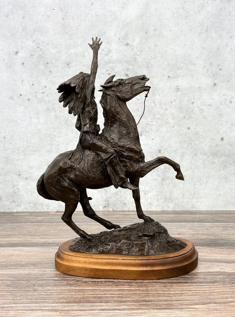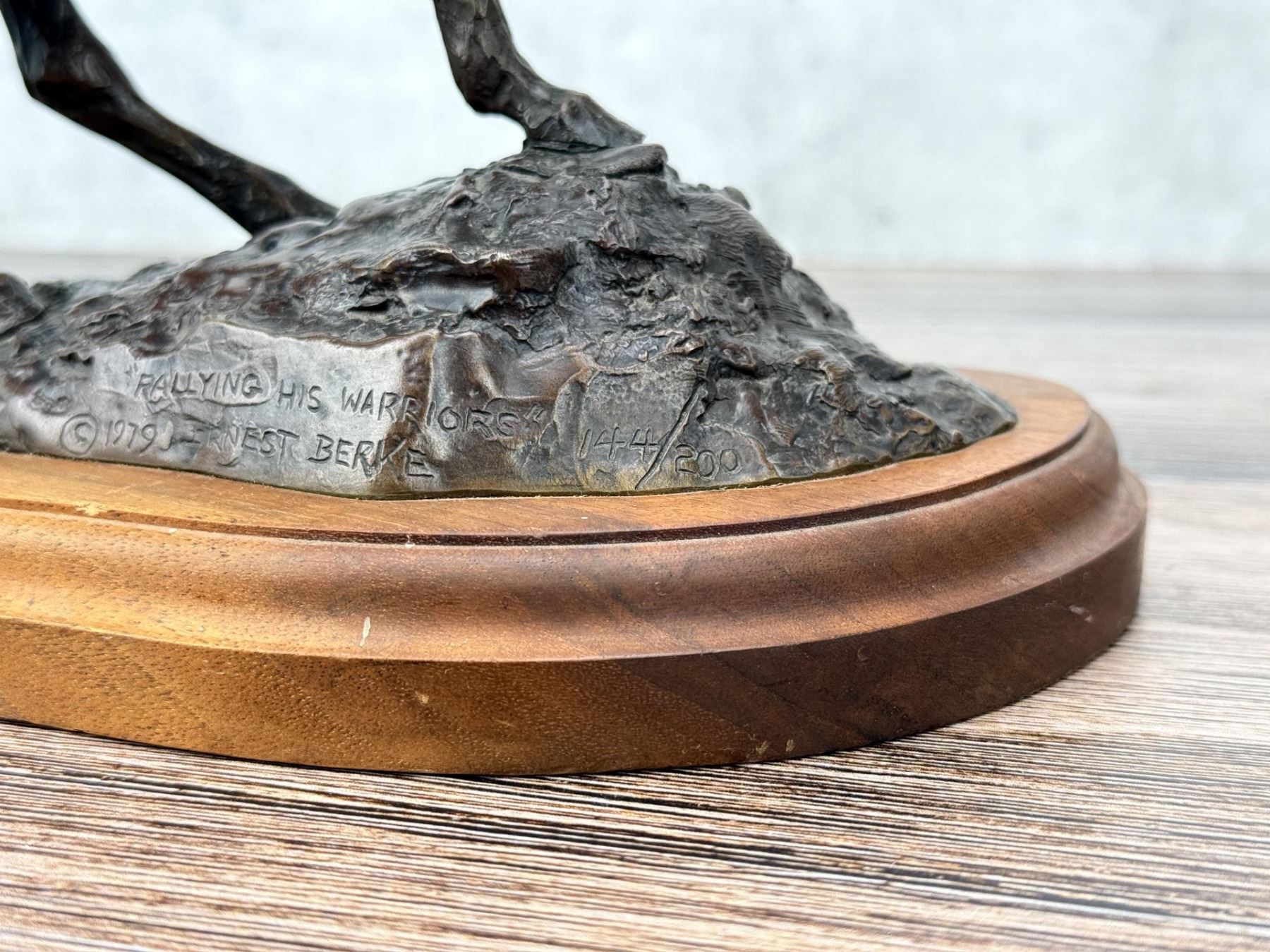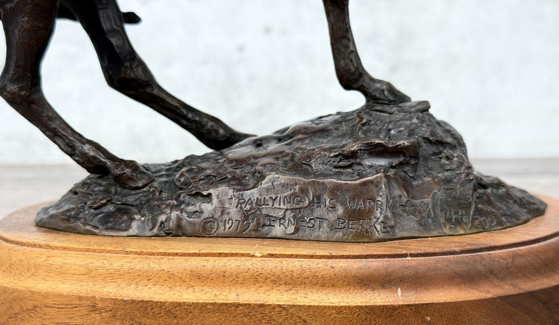 Title is Rallying His Warriors. 12 3/8" long, 5 3/8" wide, 8 5/8" tall. 144/200. Ernest Berke (1921 - 2010) was active/lived in Arizona. Ernest Berke is known for Western genre-Indian, sculpture. A sculptor and painter of western subjects and well known both in the Southwest and East Coast, Ernest Berke was born in Harlem, New York City in 1921 to a Romanian mother who designed clothes and a Russian father, who was a sheet metal worker. At six years of age, his father, who recognized his talent, encouraged him to pursue art. While working as an advertising illustrator for Sears & Roebuck for a number of years, Ernest became fascinated with the growing West, especially cowboys and Indians. A self-taught artist and anthropologist, Berke was a voracious reader. He met on a regular basis at a local New York City bookstore with a group who shared his interest in the West, and occasionally, Berke would also show his works there. Berke spent his summers in Scottsdale, Arizona, where he erected a 12-foot by 18-foot bronze sculpture titled The Buffalo Hunt. His winters were usually spent in New York City.