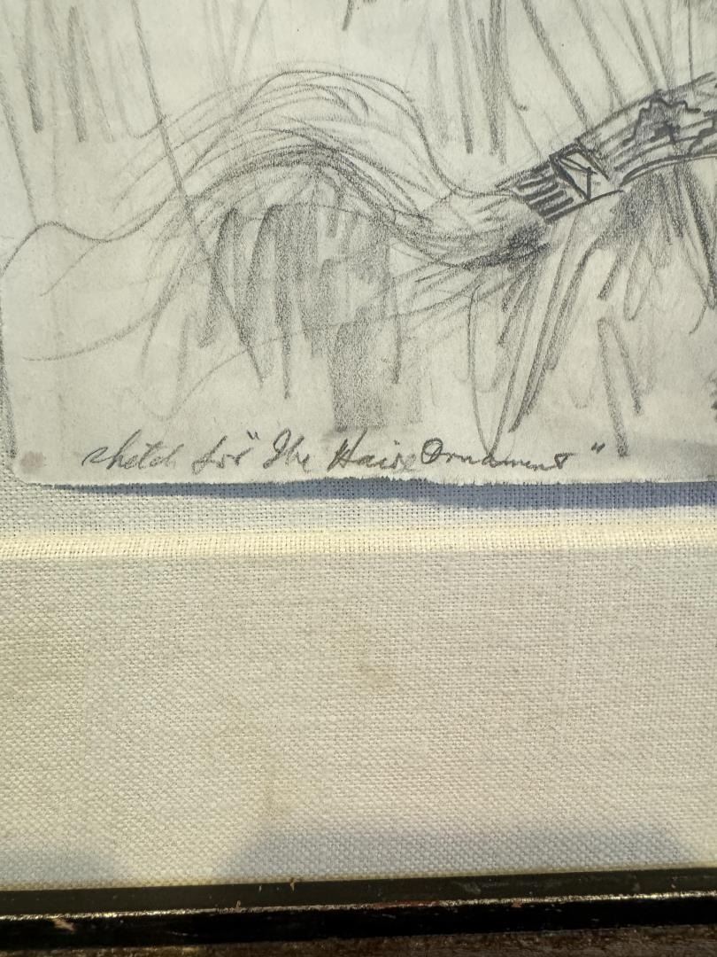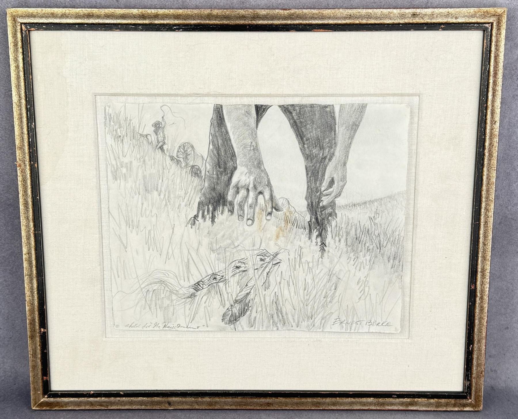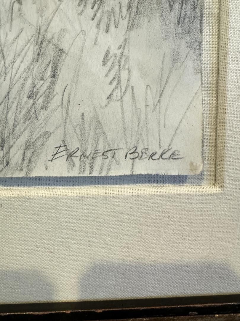 Title is The Hair Ornament. 16 1/2" by 19 1/4" framed. Pencil on Paper. Ernest Berke (1921 - 2010) was active/lived in Arizona. Ernest Berke is known for Western genre-Indian, sculpture. A sculptor and painter of western subjects and well known both in the Southwest and East Coast, Ernest Berke was born in Harlem, New York City in 1921 to a Romanian mother who designed clothes and a Russian father, who was a sheet metal worker. At six years of age, his father, who recognized his talent, encouraged him to pursue art. While working as an advertising illustrator for Sears & Roebuck for a number of years, Ernest became fascinated with the growing West, especially cowboys and Indians. A self-taught artist and anthropologist, Berke was a voracious reader. He met on a regular basis at a local New York City bookstore with a group who shared his interest in the West, and occasionally, Berke would also show his works there. When the New York Times reviewed his work, it was met with great interest, and he terminated his job to devote himself to his painting. His devotion to the West covers over four decades, completing more that 2500 paintings and nearly 80 sculptures, five of which are life-size. He has portrayed the North American Indian with considerable accuracy and sensitivity, having lived with the Northern Shoshone Indian tribe in Blackfoot, Idaho. He is the only Western artist to have been accepted to appear in the Kennedy Galleries in New York, and has been featured in the American Artist, Sotheby's, and Southwest Art. He has had studios in Long Island and Santa Fe, New Mexico, and has written and illustrated two books on the American frontier and on Indians, both commissioned by Doubleday. Berke spent his summers in Scottsdale, Arizona, where he erected a 12-foot by 18-foot bronze sculpture titled The Buffalo Hunt. His winters were usually spent in New York City.