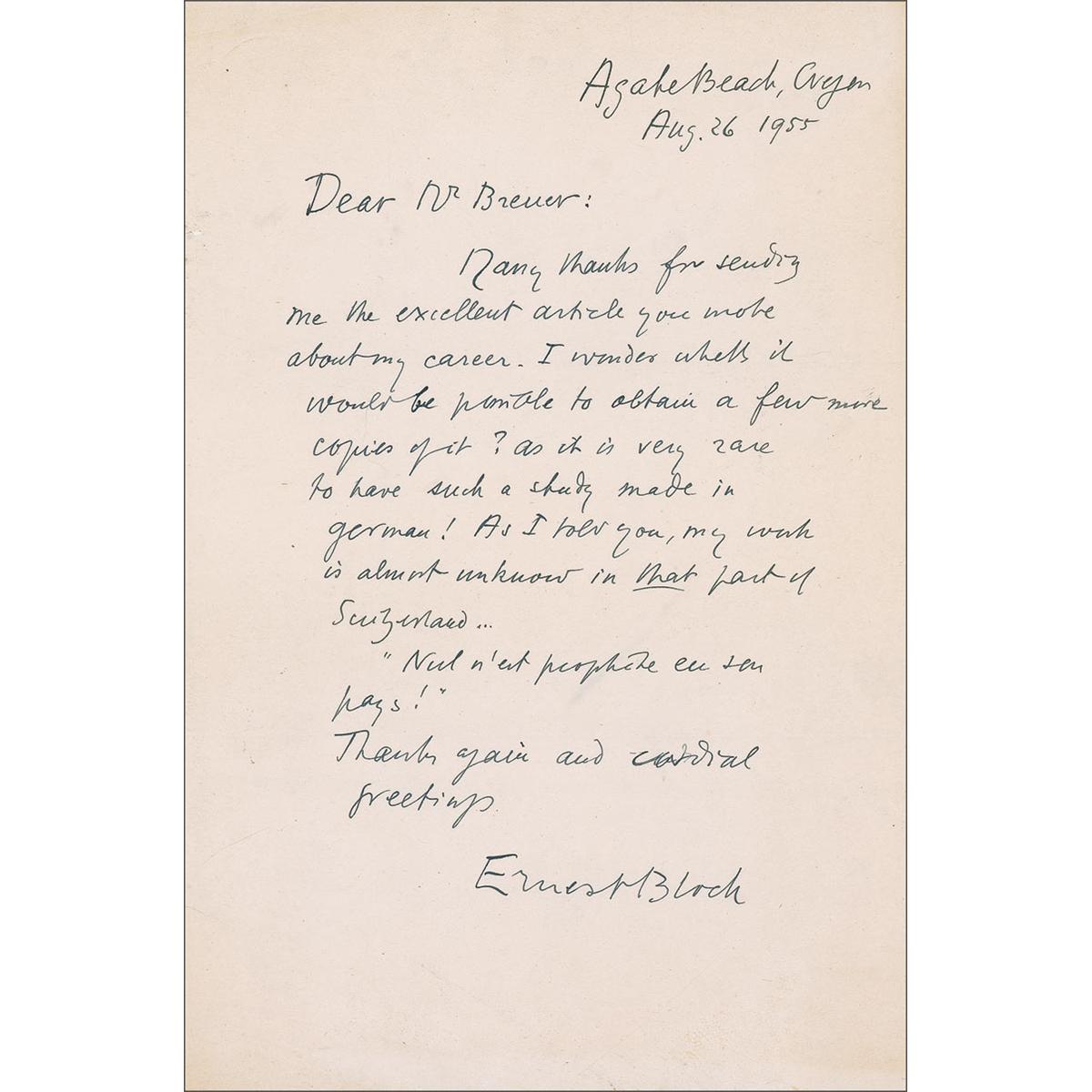 Swiss-born American composer (1880–1959) best known for his large-scale, often Jewish-inflected chamber, orchestral, and choral works. ALS, one page, 7.25 x 11, August 26, 1955. Bloch sends thanks to Mr. Brewer for an article. In part: “Many thanks for sending me the excellent article you wrote about my career…It is very rare to have such a study made in German! As I told you, my work is almost unknown in that part of Switzerland.” In fine condition, with scattered creasing, heavier to lower left, and small hole to left edge.