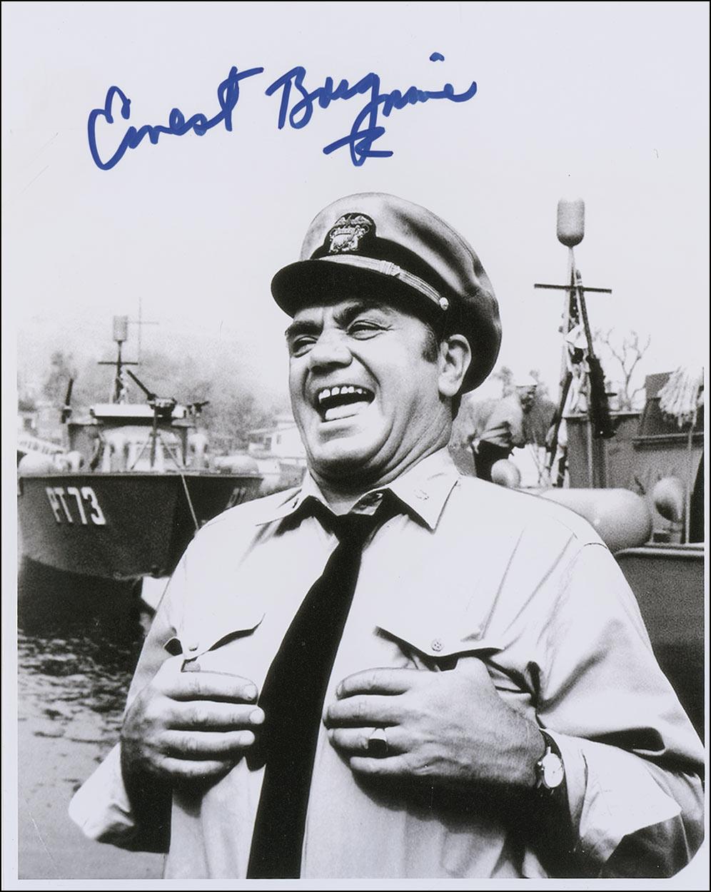 Satin-finish 8 x 10 photo of Borgnine as Quinton McHale, signed in-person in blue felt tip. In very fine condition.