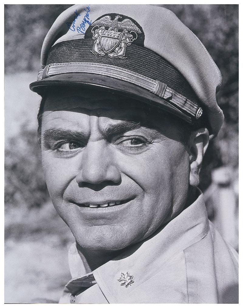 Glossy 11 x 14 photo of Borgnine as Quinton McHale, signed in blue felt tip. In fine condition with his signature a bit cramped.