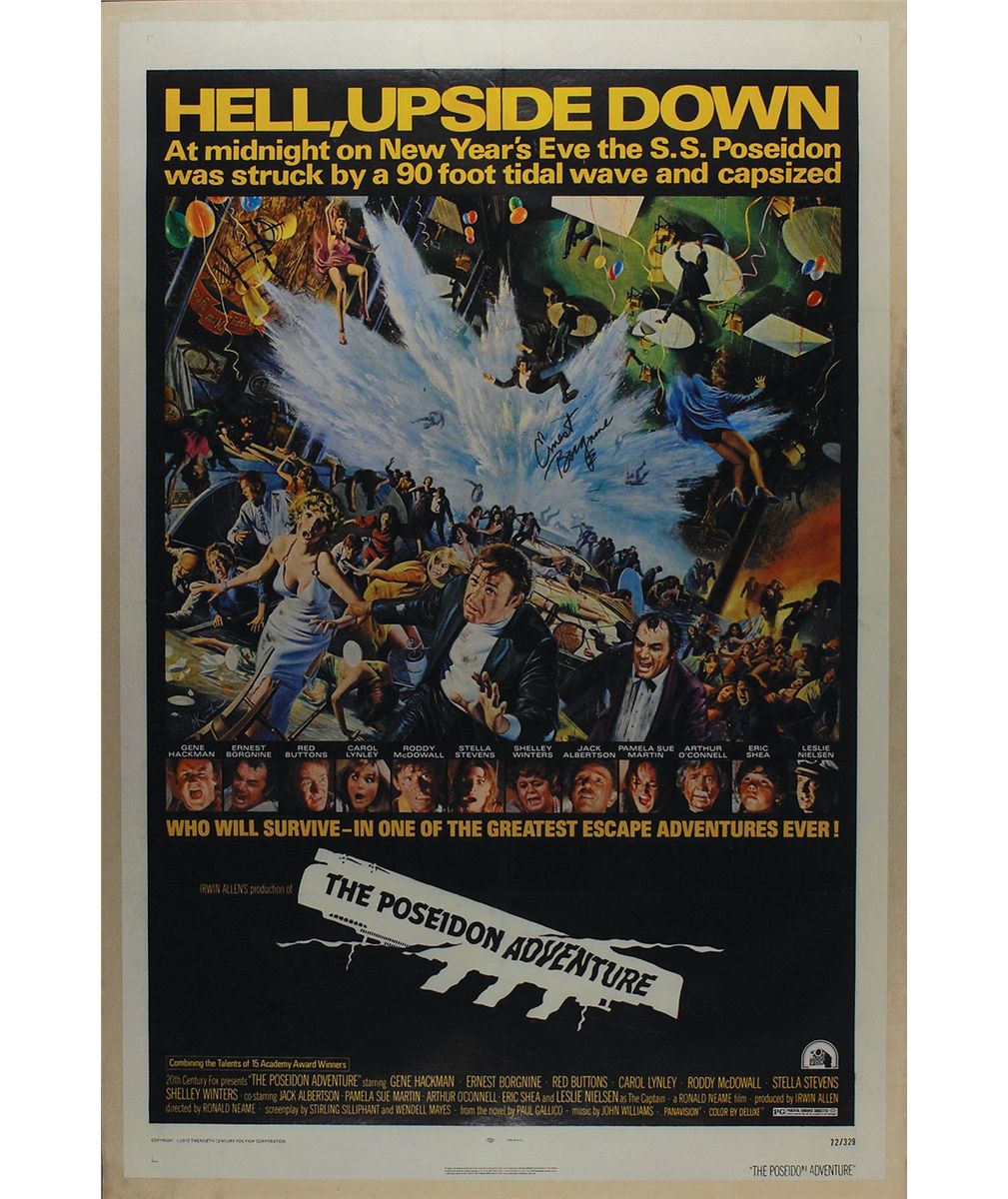 Original linen-backed color 27 x 41 one-sheet movie poster for the 1972 film The Poseidon Adventure, signed in the center in black felt tip. Rolled and in fine condition, with previous storage folds visible.