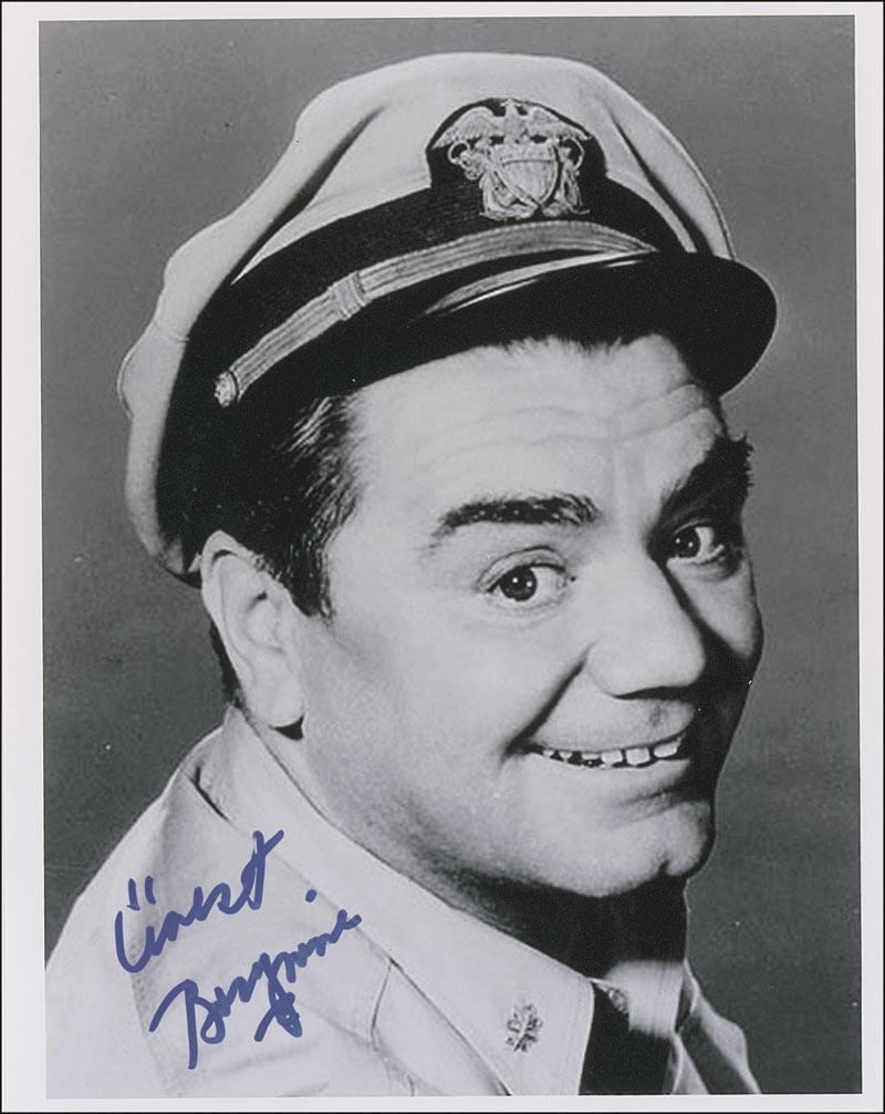 Satin-finish 8 x 10 photo of Borgnine as Quinton McHale, signed in blue felt tip. In very fine condition.
