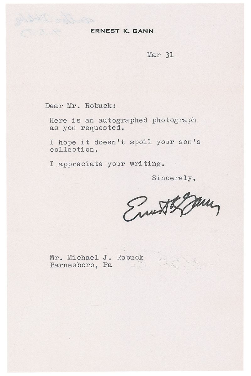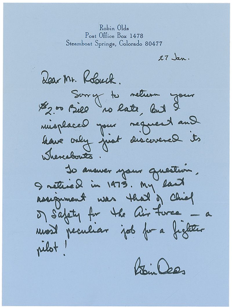 Two letters: TLS signed “Ernest K. Gann,” one page, 5.5 x 8.5, personal letterhead, March 31, 1973, responding to an autograph request; and an ALS signed “Robin Olds,” one page, 5.75 x 7.75, personal letterhead, January 27, 1987, responding to an autograph request and answering a question about his career, in part, “My last assignment was as Chief of Safety for the Air Force—a most peculiar job for a fighter pilot!” In fine condition, with some show-through from a notation to the reverse of the Gann letter. Both accompanied by their original mailing envelopes.