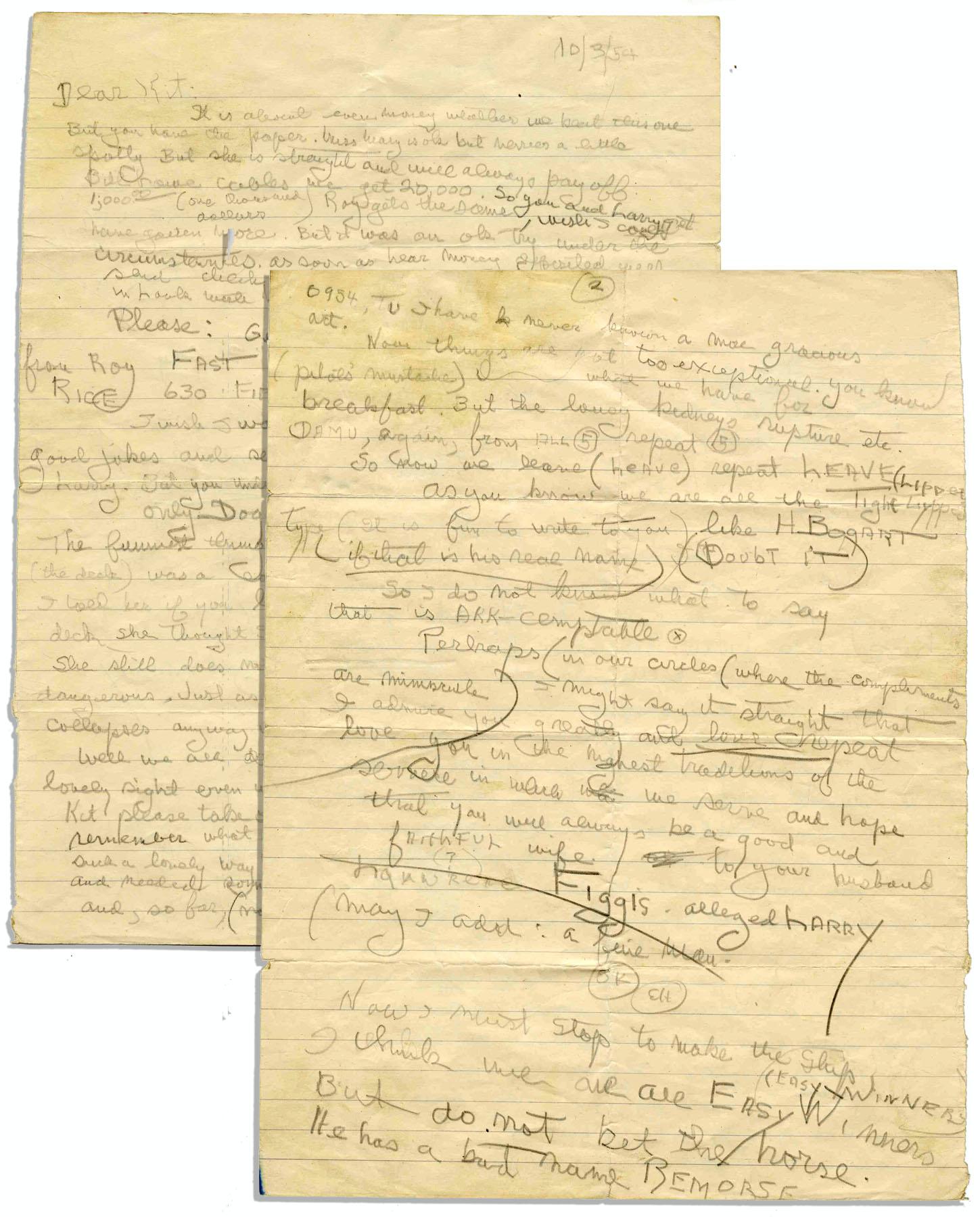 Ernest Hemingway autograph letter signed, dated 10 March 1954. Hemingway writes to Kit Figgis in the aftermath of the January 1954 Ugandan safari in which Ernest and Mary Hemingway were injured in two separate plane crashes. In part, ''Dear Kit: It is about even money whether we beat this one…Miss Mary is OK but nerves a little spotty…Only Dogs have wings and not for long. The funniest thing I remember was that Miss Mary believed that the Deck was a safe and beautiful place and when I told her if you lived on the deck you died on the deck she thought I was the conservative type. She still does not believe that Pranging Ndeges [aircraft] is dangerous. Just as she believes Mr. Simba simply collapses anyway you shoot at him (actually he does not). Well we all draw our cards and 5 aces is a lovely sight even when you know it is not true…If I should go for ----- remember what a lovely thing you did to dress up in such a lovely way that night when I was beat to the wide and needed some morale. I will never forget that, and so far…I have never known a more gracious act…But the lousy kidneys rupture etc…As you know we are all the Tight Typpes type (It is fun to write to you) like H Bogart (if that is his real name) (Doubt It)…Perhaps in our our circles (where the compliments are miniscule) I might say it straight that I admire you greatly and love repeat love you in the highest traditions…and hope that you will always be a good and faithful wife to your husband…EH…I think we are all easy winners. But do not bet the horse. He has a bad name REMORSE''. Two page pencil letter measures 7'' x 10.25''. In very good condition with mailing folds and minor chips.
