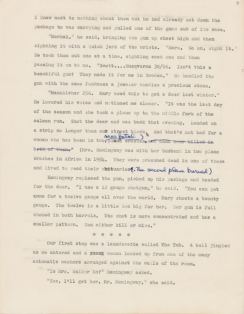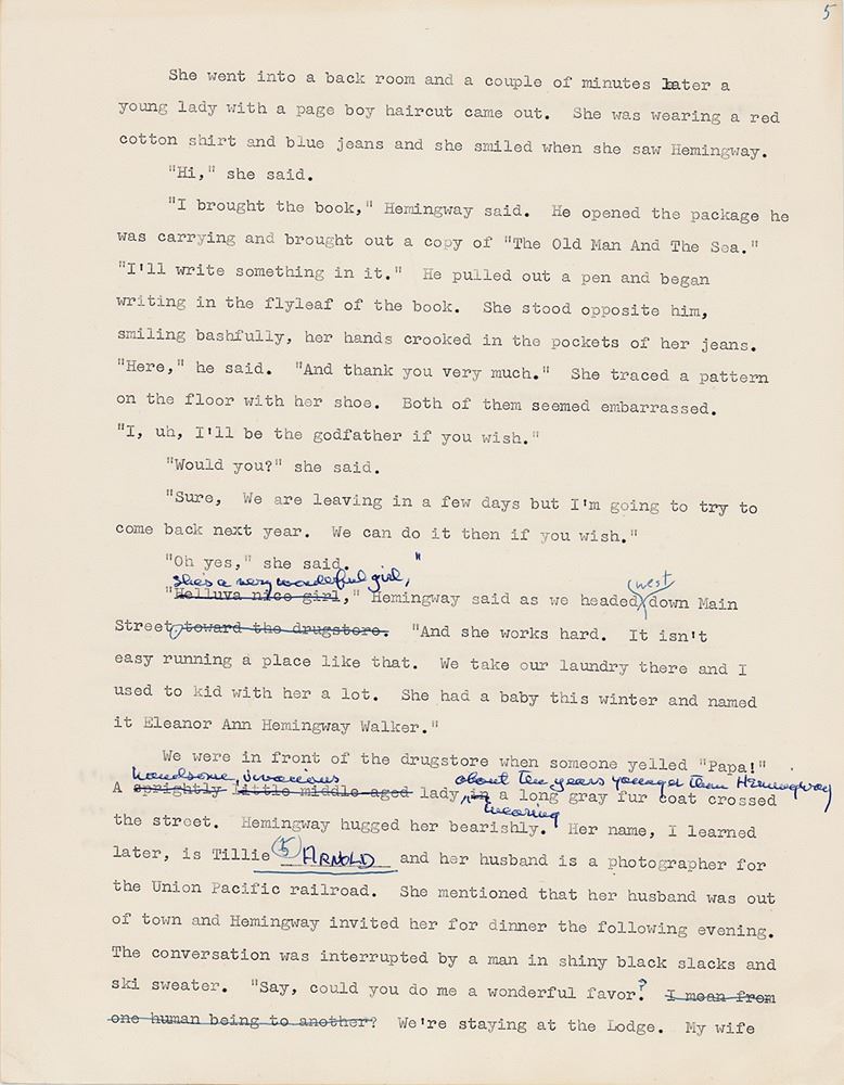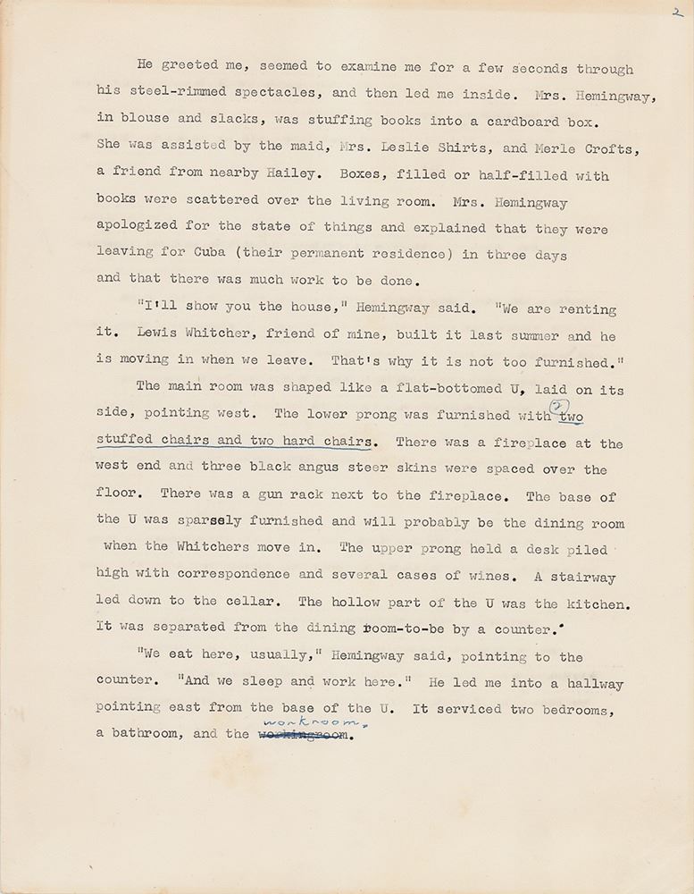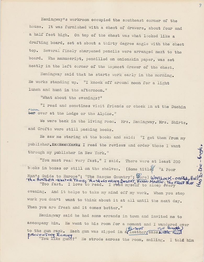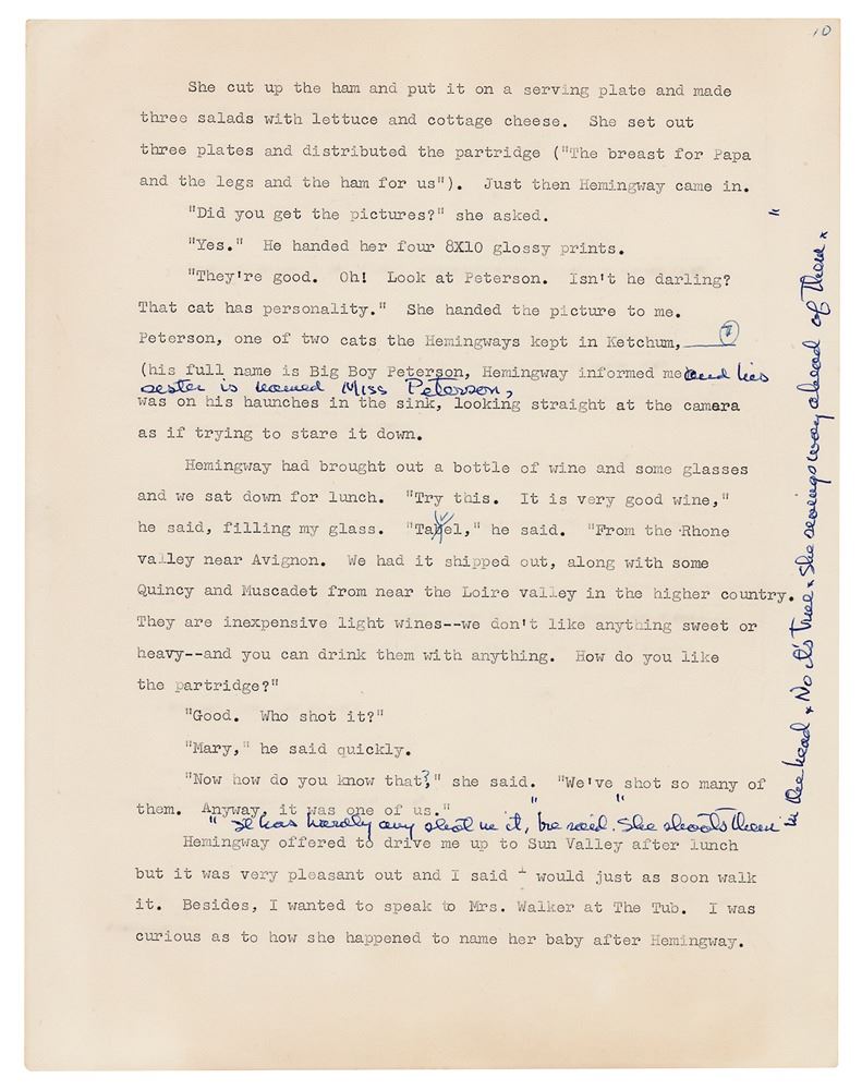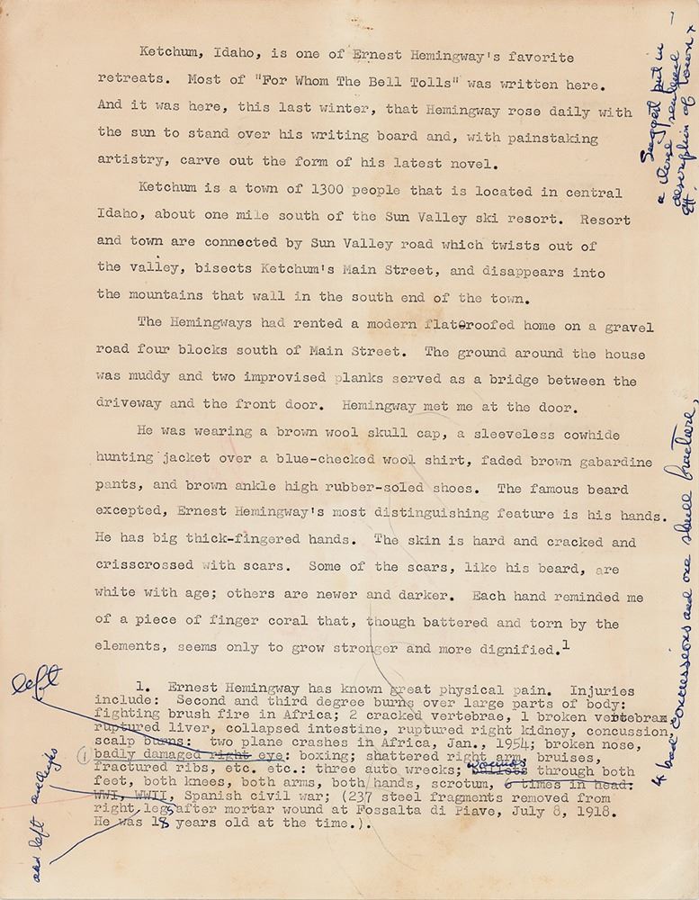 Hand-corrected typed manuscript, 11 pages, 8.5 x 11, annotated throughout in blue ballpoint by Ernest Hemingway and signed with his initials in the upper right corner of the first page: "Suggest put in a three sentence description of town. E.H." The story covers diverse topics including Hemingway's daily life in Ketchum, hunting, writing projects, Fidel Castro and the Cuban revolution, and more. Hemingway's corrections to the text, rendered in his distinctive cursive hand, range from factual (it was his "left" eye, not right, that was damaged in an accident) to dramatic (in a passage about his 1954 African plane crashes, he makes sure to add that they were "near fatal," noting, "The second plane burned"). He also makes modifications to some direct quotes, changing a description of the young woman who ran the local laundry from "Helluva nice girl" to "She's a very wonderful girl." He also writes his surname on the fifth page, in describing a lady "about ten years younger than Hemingway." In a discussion about hunting partridge with his wife, Hemingway writes ominously: "She shoots them in the head."