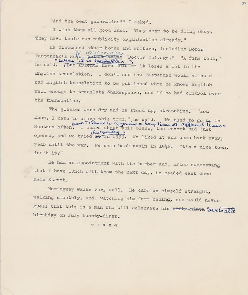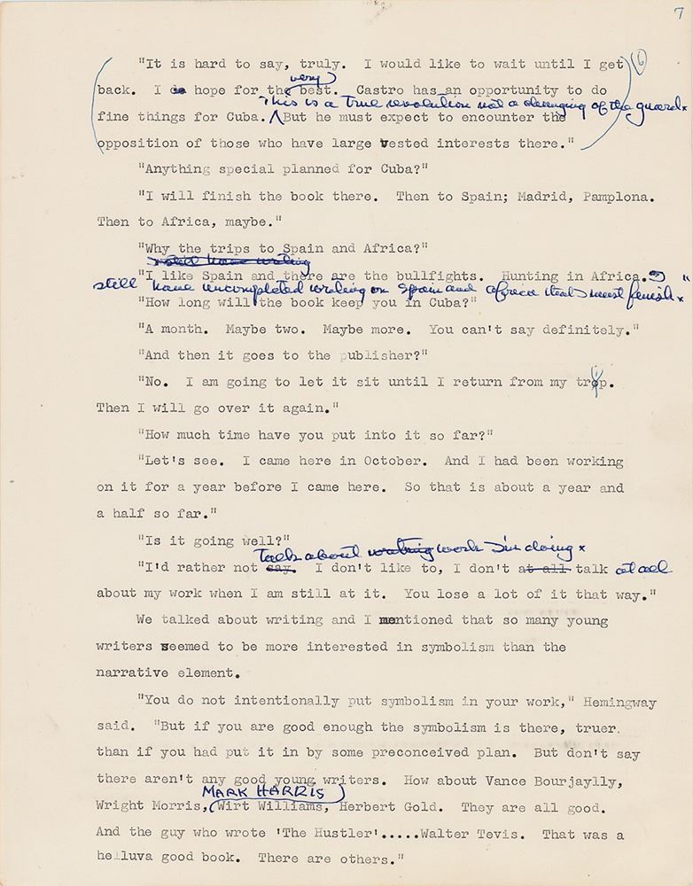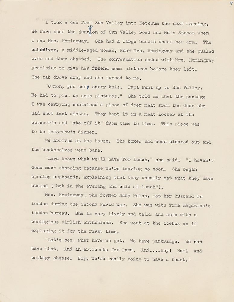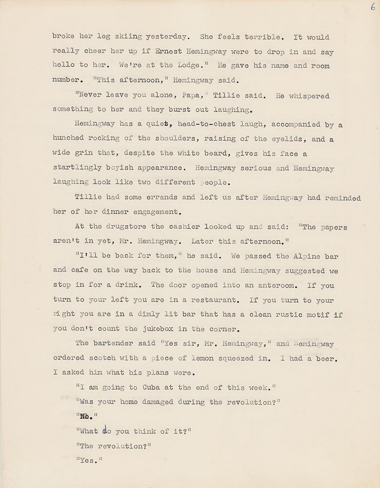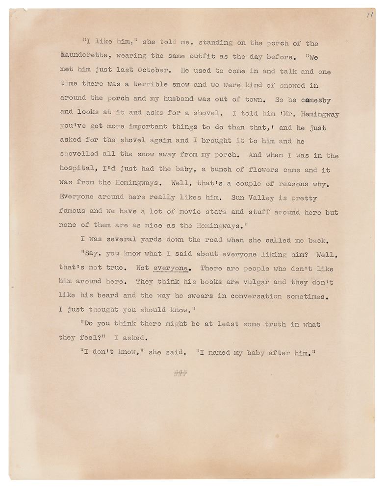 Hand-corrected typed manuscript, 11 pages, 8.5 x 11, annotated throughout in blue ballpoint by Ernest Hemingway and signed with his initials in the upper right corner of the first page: "Suggest put in a three sentence description of town. E.H." The story covers diverse topics including Hemingway's daily life in Ketchum, hunting, writing projects, Fidel Castro and the Cuban revolution, and more. Hemingway's corrections to the text, rendered in his distinctive cursive hand, range from factual (it was his "left" eye, not right, that was damaged in an accident) to dramatic (in a passage about his 1954 African plane crashes, he makes sure to add that they were "near fatal," noting, "The second plane burned"). He also makes modifications to some direct quotes, changing a description of the young woman who ran the local laundry from "Helluva nice girl" to "She's a very wonderful girl." He also writes his surname on the fifth page, in describing a lady "about ten years younger than Hemingway." In a discussion about hunting partridge with his wife, Hemingway writes ominously: "She shoots them in the head."