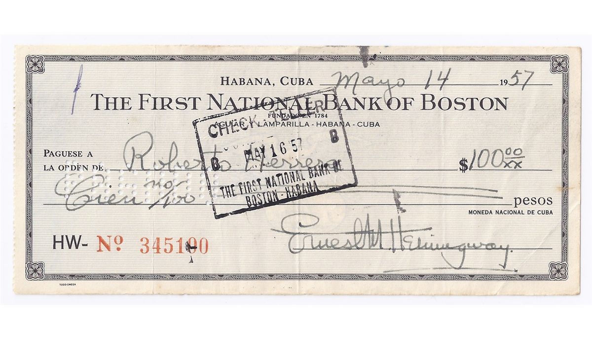 Check signed ''Ernest M. Hemingway''. Check, dated 14 May 1957, is made out to Hemingway's friend Roberto Herrera, who also served as manager of his estate in Cuba called Finca Il Vigia. Issued in the amount of 100 pesos, check is drawn on his account with the First National Bank of Boston, Havana branch. Check is endorsed to verso by Herrera and features standard cancellations. Measures 6.25'' x 2.75''. Near fine. Provenance from Herrera himself, who acted as conservator of the Hemingway Museum in Cuba after his friend's death.