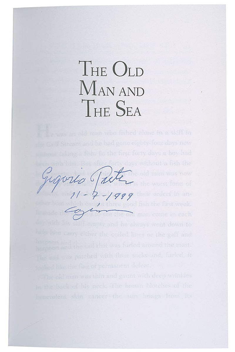 Signed book: The Old Man and the Sea. Later printing. NY: Simon & Schuster, 1995. Softcover, 5.25 x 8, 127 pages. Signed on the half-title page in blue ballpoint, “Gregorio Fuentes, 11-7-1999, Cojimar.” In very fine condition.