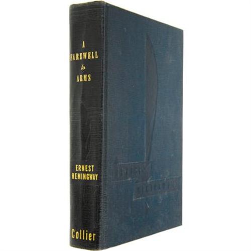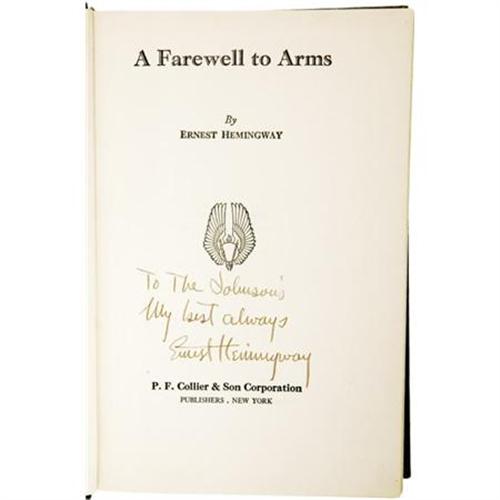 <B>Ernest Hemingway Inscribed: </B></I><B><I>A Farewell to Arms</B></I></B></I>. (New York: P. F. Collier & Son, 1929), from the Collier set, 355 pages, inscribed by the author on the title page: “<I>To the Johnson’s My best always Ernest Hemingway</B></I>”, black boards with embossed decoration, gilt titles on the spine, 8vo (5.5” x 8.25”), light toning to pages and edges, shelf wear to the spine and corners, else very good in a blue cloth slip case.<BR><BR><b>Shipping:</b> Books & Catalogs (<a target="_blank" href="http://www.heritageauctions.com/common/shipping.php">view shipping information</a>)