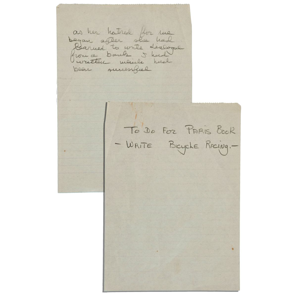 Interesting Ernest Hemingway autograph note, unsigned, referring to his book, ''A Moveable Feast.'' Autograph note in pencil reads: ''To Do For Paris Book / -Write Bicycle Racing.-'' and on the verso: ''as her hatred for me / began after she had / learned to write dialogue / from a book I had / written which had / been successful.'' The ''Paris Book'' he refers to is ''A Moveable Feast,'' a memoir of his time spent in Paris. Note measures 6.5'' x 4.25'' on two pages, front and verso. Near fine condition.