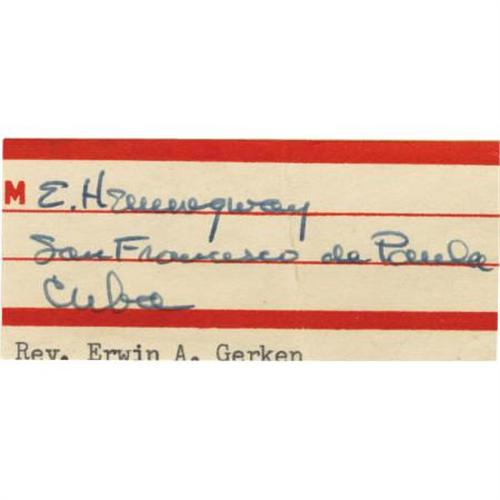 <B>Ernest Hemingway Signature</B></I> "<I>E. Hemingway</B></I>" in ink along with his address "<I>San Francisco de Paula Cuba</B></I>" on a 3" x 1.25" clip excised from a mailing label on an envelope. Hemingway first lived in Cuba during the late 1930s at the Hotel Ambos Mundos. In 1940, he took part of the money he earned by writing <I>For Whom the Bell Tolls</B></I> and purchased a home, the Finca Vigia, in San Francisco de Paula, a suburb of Havana. It was at the Finca that he kept his fishing boat the <I>Pilar</B></I> which would be immortalized in the Nobel Prize winning novel <I>The Old Man and the Sea.</B></I> Cuba would remain his home until the political situation in 1960 forced his move to the United States. His home there is now a museum owned by the Cuban government. One vertical fold, else fine.<BR><BR><b>Shipping:</b> Flat Material, Small (<a target="_blank" href="http://www.heritageauctions.com/common/shipping.php">view shipping information</a>)
