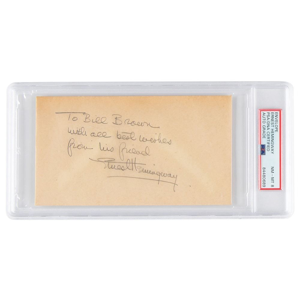 Vintage pencil signature and inscription, "To Bill Brown, with all best wishes, from his friend, Ernest Hemingway,& rdquo; on an off-white 6.5 x 3.5 envelope. In fine condition, with uniform toning. Encapsulated and graded by PSA/DNA as "NM-MT 8."