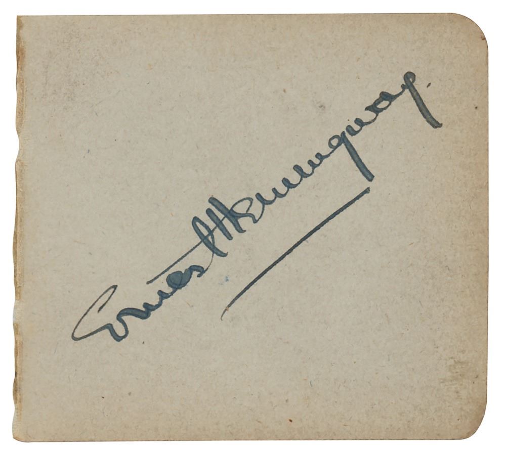 Nice vintage fountain pen signature, "Ernest Hemingway," on a light gray 2.75 x 2.5 album page. In fine condition.