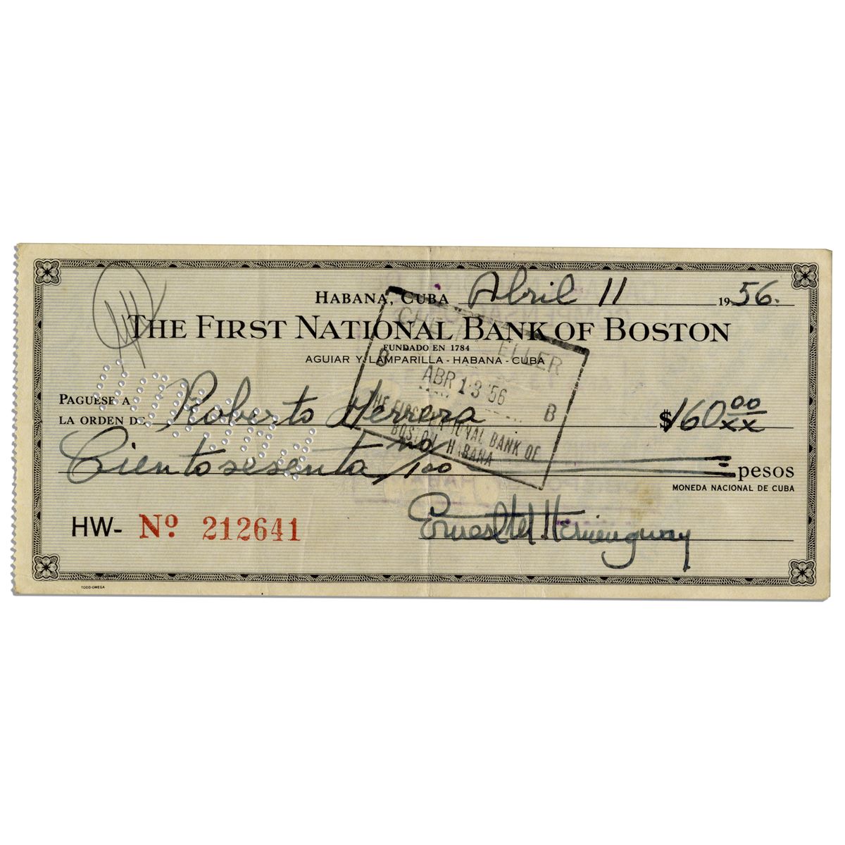 Ernest Hemingway signed check, filled out entirely in his hand and dated 11 April 1956. Hemingway addresses a check to Roberto Herrera, friend and manager of his ''Finca Il Vigia'' property in Cuba, which is now a museum. Signed ''Ernest M. Hemingway'', check for $160 is drawn on the First National Bank of Boston, Havana Branch. Measures 6.25'' x 2.75''. Bank cancellation stamps not affecting signature. Herrera endorses verso of check. Near fine.
