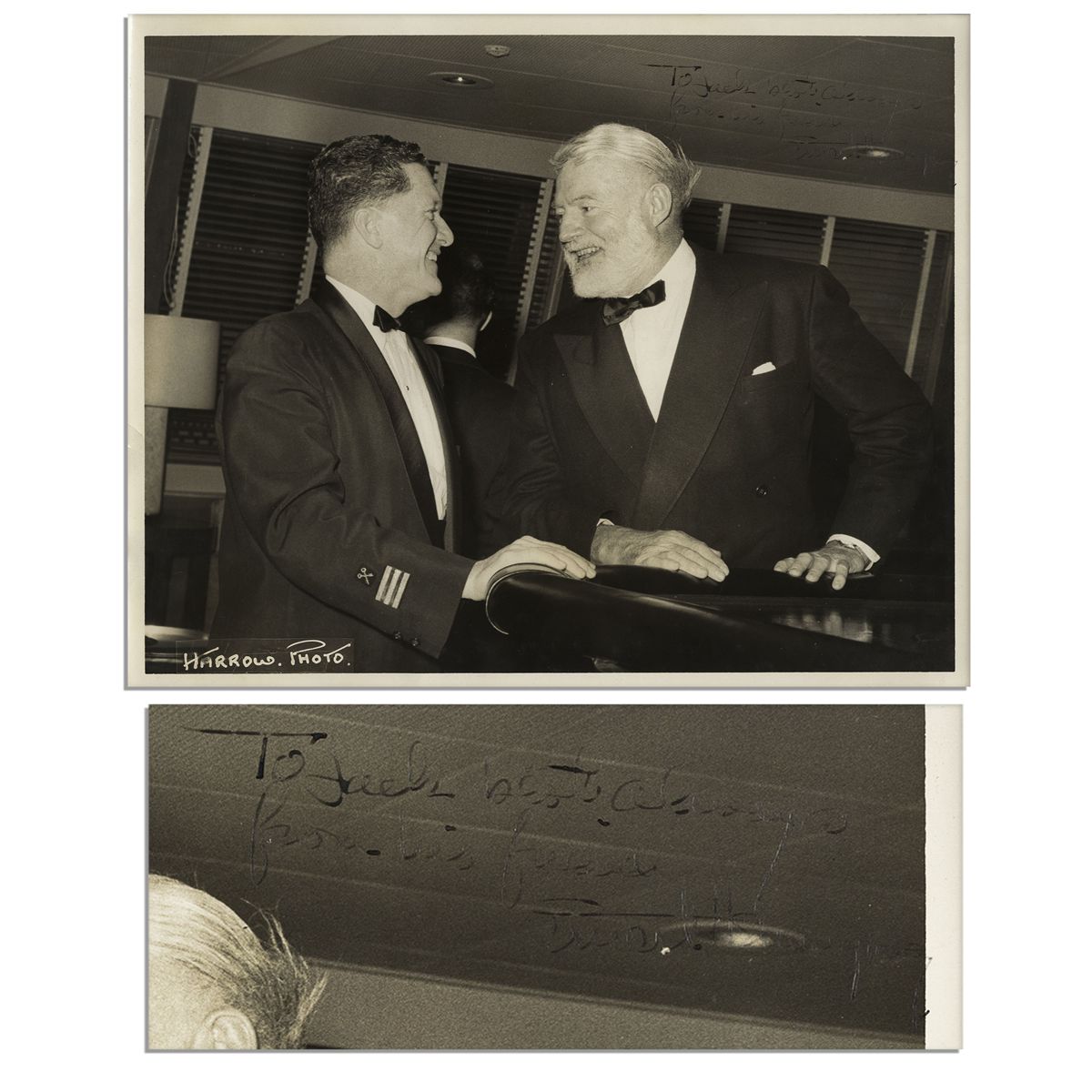 Ernest Hemingway signed photo of him in jovial conversation with Jack Haley, Chief Steward of the S.S. Constitution. Hemingway's inscription to the upper right of the image reads, ''To Jack best always / from his friend / Ernest Hemingway''. Glossy photo bears a Robert Harrow stamp developed into the image's lower left. Measures 10'' x 8''. Some fading to inscription and adhesive residue to verso, else near fine.