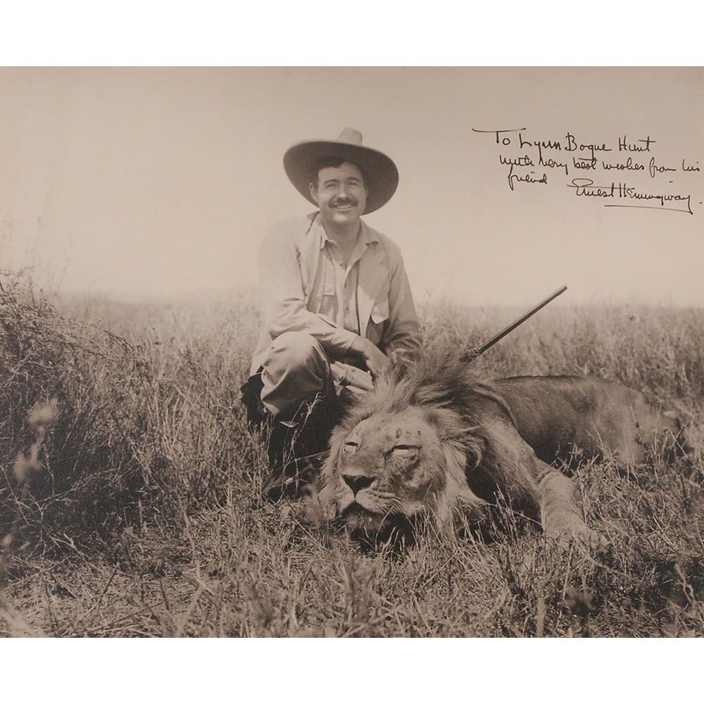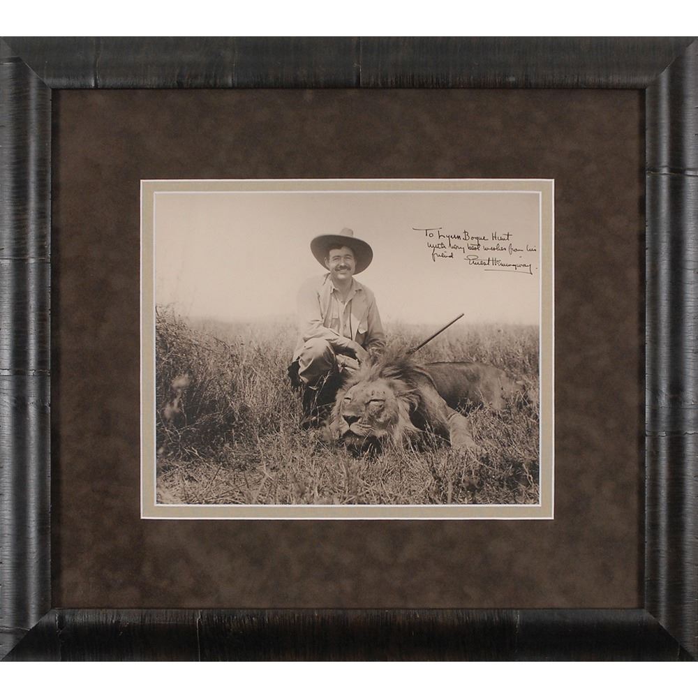 Superb vintage matte-finish 11.5 x 9.25 photo of Hemingway posing with a lion he brought down on safari in January of 1934, signed and inscribed in black ink, "To Lynn Bogue Hunt, with very best wishes from his friend, Ernest Hemingway." Nicely double-matted and framed to an overall size of 21.5 x 19. In fine condition. Lynn Bogue Hunt was America's foremost periodical wildlife artist. From 1904 to 1960, he produced the cover art for over 100 issues of Field and Stream. Hunt also did work for Saturday Evening Post, Colliers, Country Gentleman, Boy's Life and illustrated over 50 books.