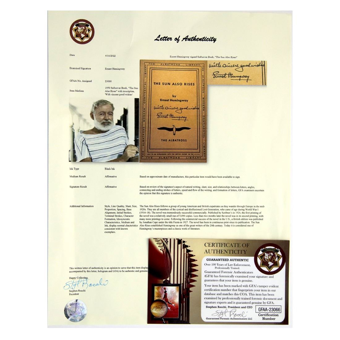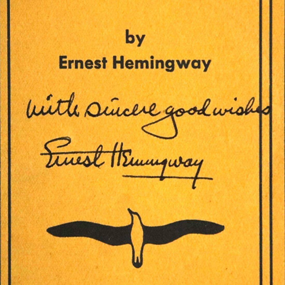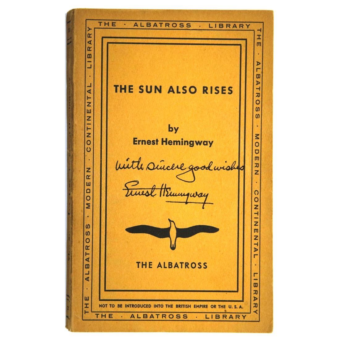 Ernest Hemingway (July 21, 1899 – July 2, 1961). Ernest Hemingway signed book, “The Sun Also Rises” Crisp, clear, bold signature in black ink on the cover of the book with inscription, ‘with sincere good wishes.’ The quintessential novel of the Lost Generation, The Sun Also Rises (Fiesta) is one of Ernest Hemingway's masterpieces and a classic example of his spare but powerful writing style. A poignant look at the disillusionment and angst of the post-World War I generation, the novel introduces two of Hemingway's most unforgettable characters: Jake Barnes and Lady Brett Ashley. The story follows the flamboyant Brett and the hapless Jake as they journey from the wild nightlife of 1920s Paris to the brutal bullfighting rings of Spain with a motley group of expatriates. It is an age of moral bankruptcy, spiritual dissolution, unrealized love, and vanishing illusions. First published in 1926, The Sun Also Rises helped to establish Hemingway as one of the greatest writers of the twentieth century. Comes with a Letter of Authentication from Guaranteed Forensic Authenticators (GFA), along with the GFA guarantee of authenticity.