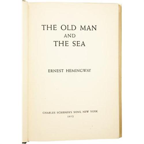 <B>Ernest Hemingway: <I>The Old Man and the Sea</B></I></B></I> (New York: Charles Scribner's Sons, 1952), first edition, first issue ("A" and Scribner's seal on the copyright page), 140 pages, light blue cloth with silver spine titles, 8vo (5.75" x 8.25"), dust jacket. Previous owner's signature on the front free endpaper. The book is in about very good condition, with wear to the spine titles and edges, in a fair unclipped dust jacket.<BR><BR><b>Shipping:</b> Books & Catalogs (<a target="_blank" href="http://www.heritageauctions.com/common/shipping.php">view shipping information</a>)