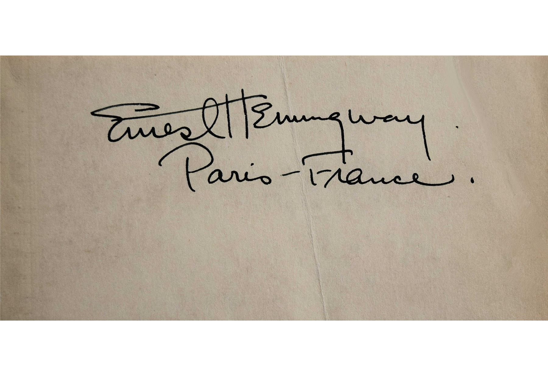 5 1/2 in. by 2 1/2 in. slip signed: Ernest Hemingway Paris-France
