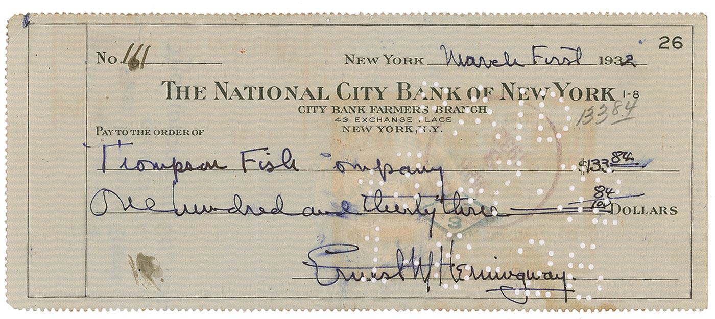 Bank check, 6.5 x 2.75, filled out and signed by Hemingway, “Ernest W. Hemingway,” payable to Thompson Fish Company for $133.84, March 1, 1932. In very good condition, with cancellation holes and show-through from stamp on reverse affecting signature, a couple light brushes to signature, a bisecting vertical fold one through a single letter of signature, pencil notation to right side, and some light soiling and wrinkling. During his years in Key West, Hemingway befriended Charles Thompson, owner of Thompson Fish Company. When Hemingway went on a safari in 1933, Thompson went with him and became the inspiration for the character 'Old Karl' in Green Hills of Africa. Hemingway and Thompson were great friends for many years up until Hemingway's suicide in 1961.