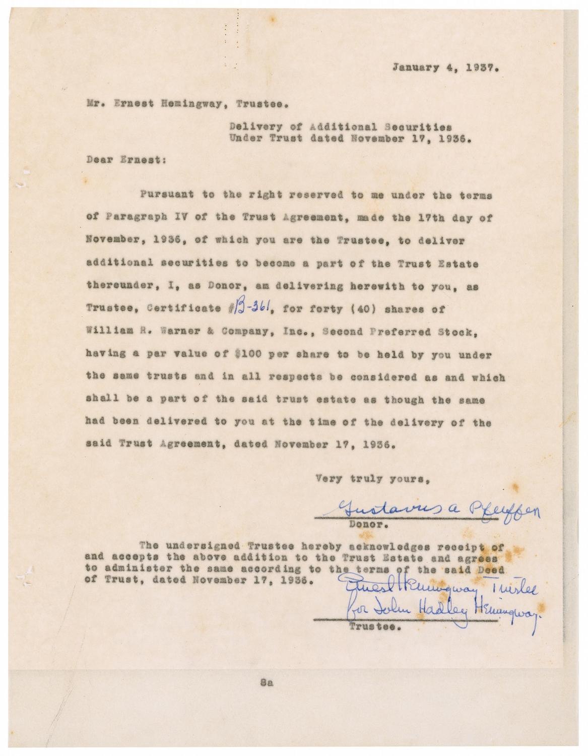 Carbon DS, signed in ink “Ernest Hemingway Trustee for John Hadley Hemingway,” one page, 8.5 x 11, January 4, 1937. Gustavus A. Pfeiffer begins “Dear Ernest, Pursuant to the right reserved to me under the terms of Paragraph IV of the Trust Agreement, made the 17th day of November, 1936, of which you are the Trustee, to deliver additional securities to become part of the Trust Estate thereunder, I, as Donor, am delivering herewith to you, as Trustee, Certificate #B424, for twenty-three (23) shares of William R. Warner & Company, Inc., Second Preferred Stock, having a par value of $100 per share…” Hemingway “acknowledges receipt of and accepts the above addition to the Trust Estate and agrees to administer the same according to the terms of the said Deed of Trust, dated November 17, 1936.” In fine condition, with a couple small tears to left edge, two pinholes to bottom edge, and some scattered mild spots of foxing over signature areas. Accompanied by a copy of the complete 14-page Deed of Trust, dated November 17, 1936, including a photocopy of this document and photocopies of three others signed by Hemingway.