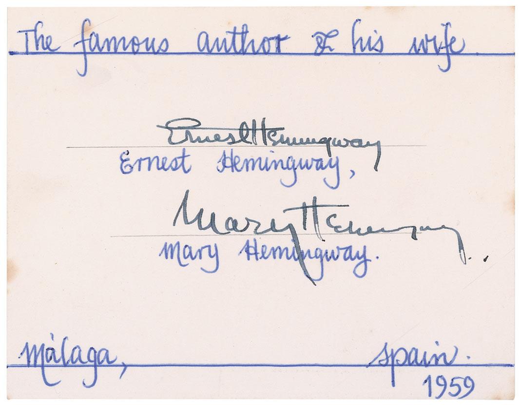 Vintage fountain pen signatures, “Ernest Hemingway,” and also signing for his wife “Mary Hemingway,” on a 4.5 x 3.5 card, with collector’s notations at the top and bottom of card, indicating “Malaga, Spain 1959,” as well as small notations underneath both signatures. In fine condition, with a bit of trivial foxing. Quite unusual for Hemingway to sign for his wife as well.