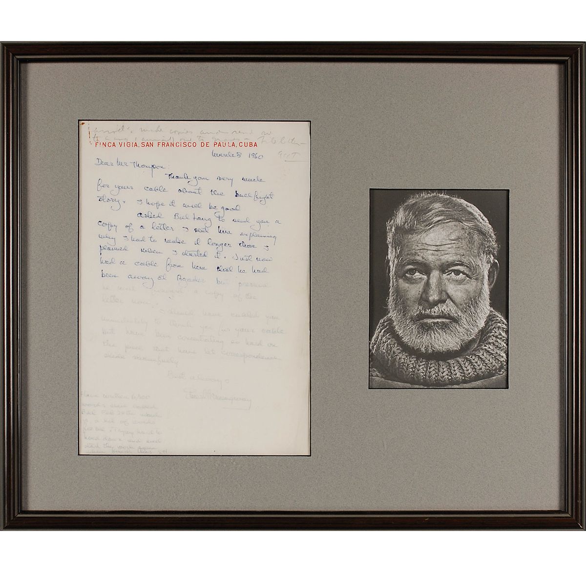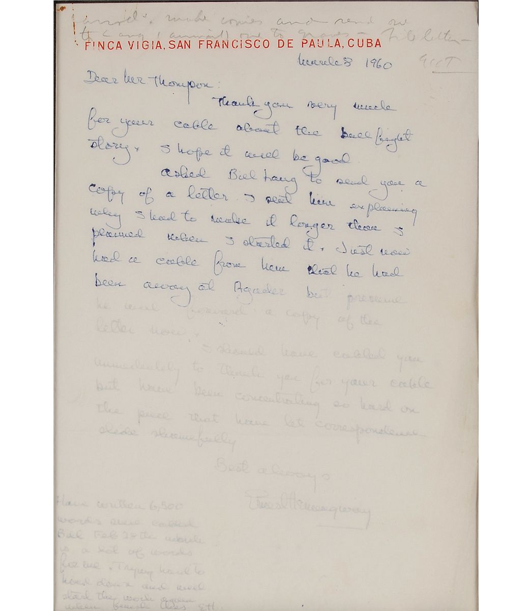 ALS, one page, 7.5 x 11, Finca Vigia, San Francisco de Paula, Cuba letterhead, March 8, 1960. Hemingway writes to Ed Thompson, his editor at Life magazine, which had commissioned what was supposed to be a short article on bullfighting. Even before he was finished, Hemingway realized that the piece had grown into something much more substantial, inducing him to explain the situation in responding to a communication from Thompson. In full: “Thank you very much for your cable about the bullfight story. I hope it will be good. Asked Bill Lang to send you a copy of a letter I sent him explaining why I had to make it longer than I planned when I started it. Just now had a cable from him that he had been away at Agader but presume he will forward a copy of the letter now. I should have called you immediately to thank you for your cable but have been concentrating so hard on the piece that have let correspondence slide shamefully.” After signing, Hemingway adds a postscript, signing again with his initials: “Have written 6500 words since called Bill Feb. 28th which is a lot of words for me. Trying hard to hold down and will start the work again when finish this.” Matted and framed with a photo to an overall size of 19 x 16. In fine condition, with Hemingway changing pens halfway through the letter (the second half somewhat lighter than the first), penciled notation and small paperclip stain at top edge, a few wrinkles, and a very subtle touch of scattered soiling. The book that evolved from his Life commission, The Dangerous Summer, was a yearlong chronicle of the rivalry between two matadors. Published in 1960, it was the last major work that Hemingway completed. In fact, scholars conject that it was Hemingway’s inability to edit this piece that led to his belief that he could no longer write to his full potential and, ultimately, his suicide in 1962.