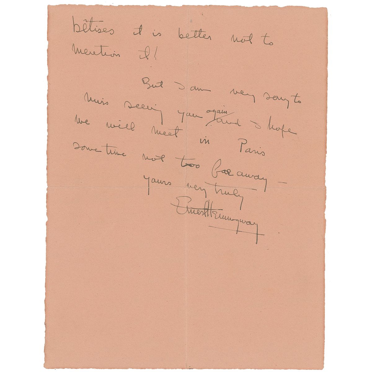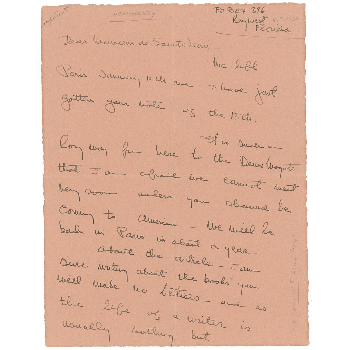 ALS, one page both sides, 6.25 x 8, postmarked February 4, 1930. Early letter from Florida to the journalist Robert de Saint Jean in Paris, who planned an article on Hemingway’s books. Saint Jean was a central figure of the Paris intellectual world and the life partner of famous writer Julien Green. He and Hemingway had met in the late 1920’s at the time of the “Moveable Feast.” In full: “It is such a long way from here to the Deux Magots that I am afraid we cannot meet very soon unless you should be coming to America. We will be back in Paris in about a year. About the article. I am sure writing about the books you will make no bêtises—and as the life of a writer is usually nothing but bêtises it is better not to mention it. But I am very sorry to miss seeing you again and I hope we will meet in Paris sometime not too far away.” Central horizontal and vertical fold, one passing through first letter of signature, several pencil notations to edges and a bit of light soiling, otherwise fine condition. Accompanied by the original mailing envelope, addressed in Hemingway’s hand.