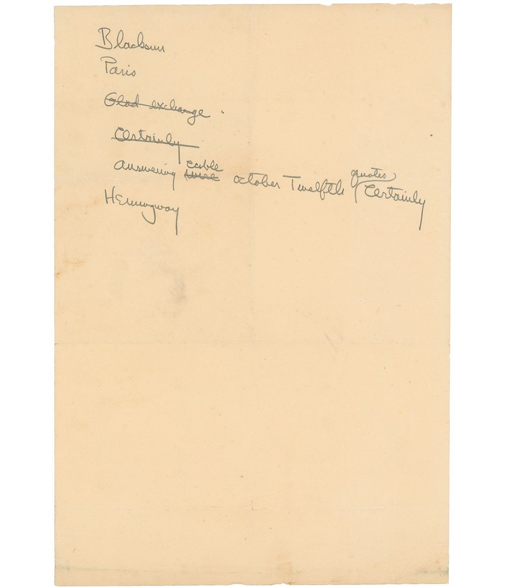 Handwritten list in pencil, signed “Hemingway” at the conclusion, one page, folded to 8.5 x 7.25. List reads: “Blacksun/Paris/Glad Exchange [crossed out]/Certainly [crossed out]/Answering cable October Twelfth quotes certainly.” Intersecting folds, light creasing and soiling, small tears to left and top edges, and slight chipping to top edge, otherwise fine condition. The Black Sun Press was based in Paris and published some of Hemingway’s work, which is likely what he is referring to in this list.