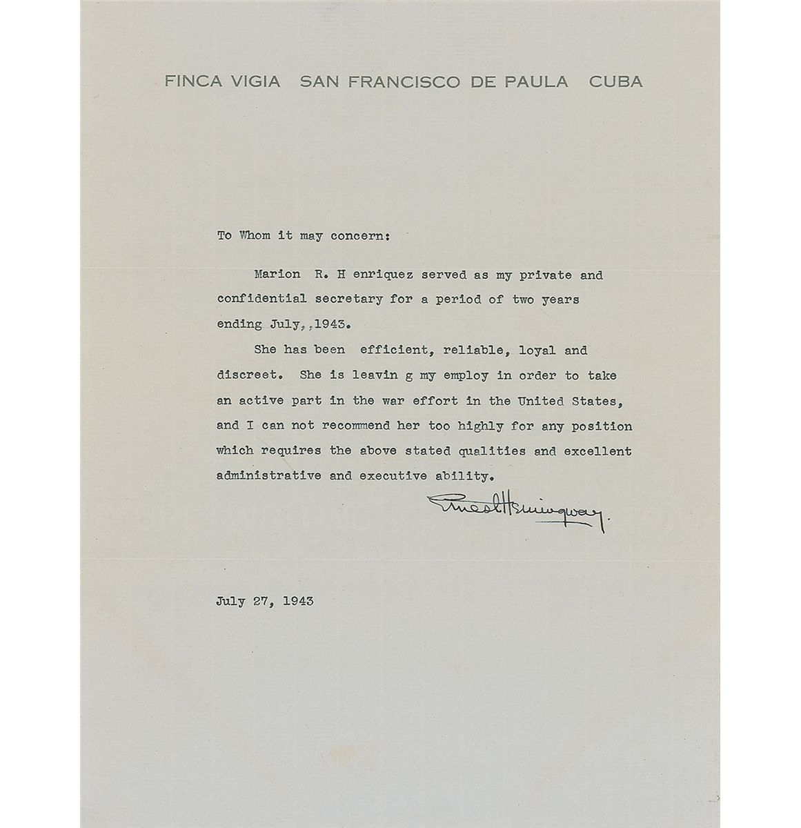 TLS, one page, 8.5 x 11, personal letterhead, July 27, 1943. Letter of recommendation for his former secretary. In full: “Marion R. Henriquez served as my private and confidential secretary for a period of two years ending July, 1943. She has been efficie