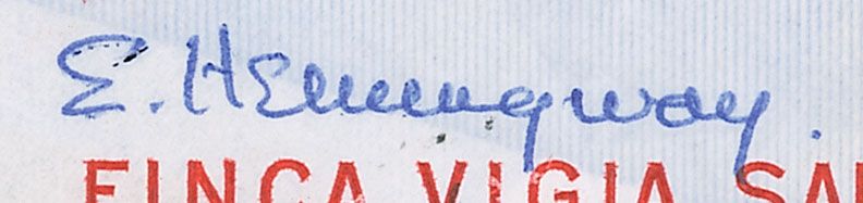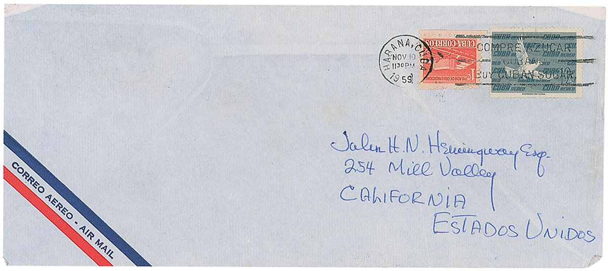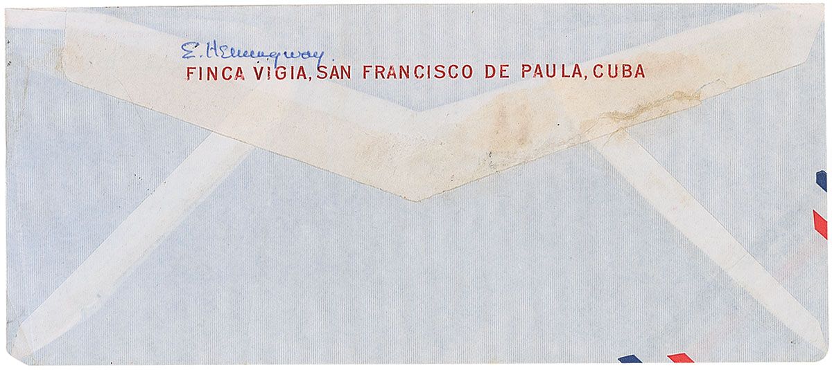 Air mail envelope, postmarked Habana, Cuba, November 10, 1959, addressed by Hemingway to his son, “John H. N. Hemingway, Esq., 254 Mill Valley, California, Estados Unidos,” and signed on the reverse, “E. Hemingway.” In very good to fine condition, with scattered creases, a couple lightly affecting address, a vertical crease through a single letter of signature, and toning along bottom of back flap.
