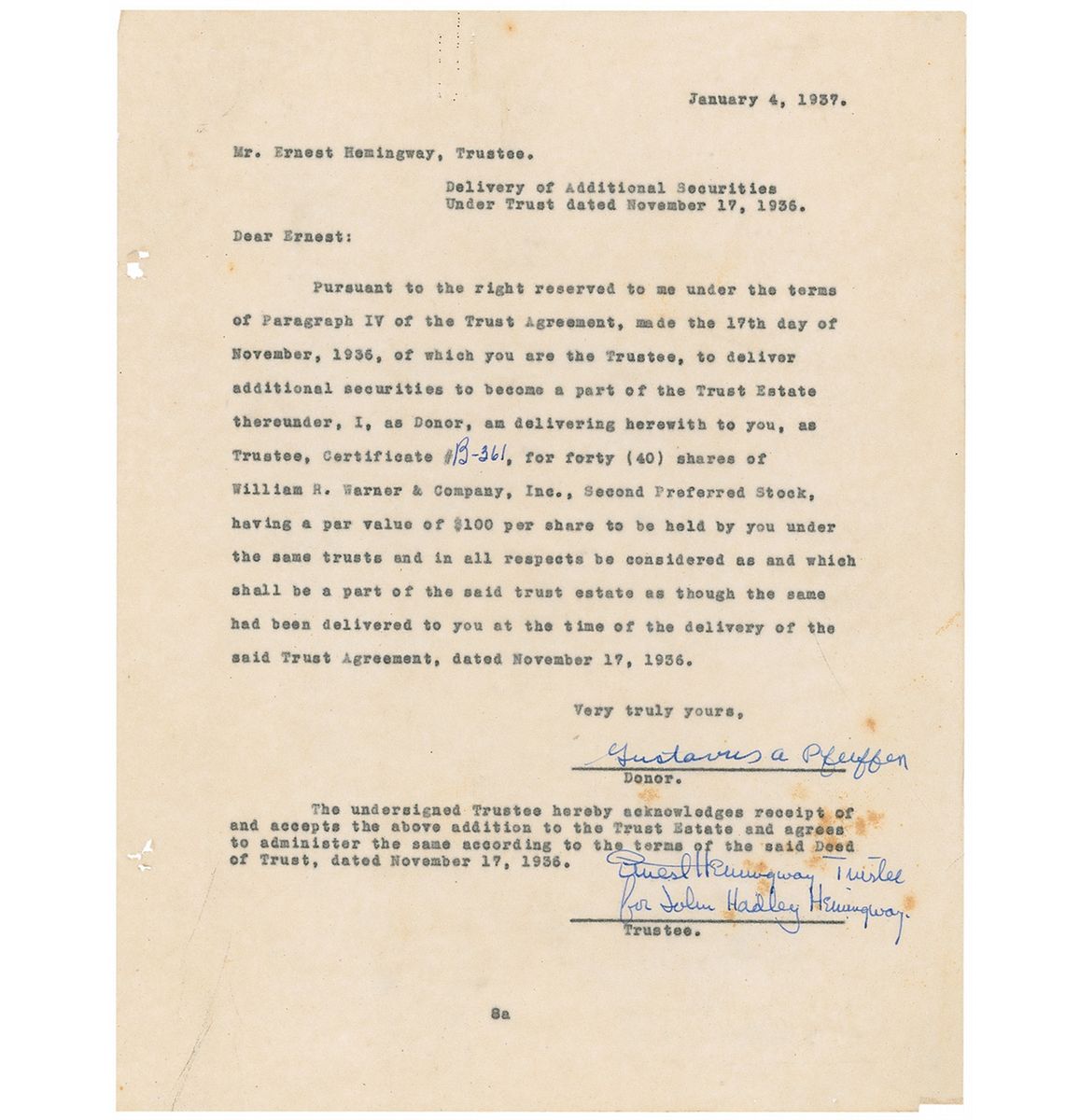 Carbon DS, signed in ink “Ernest Hemingway Trustee for John Hadley Hemingway,” one onionskin page, 8.5 x 11, January 4, 1937. Gustavus A. Pfeiffer begins “Dear Ernest, Pursuant to the right reserved to me under the terms of Paragraph IV of the Trust Agreement, made the 17th day of November, 1936, of which you are the Trustee, to deliver additional securities to become part of the Trust Estate thereunder, I, as Donor, am delivering herewith to you, as Trustee, Certificate #B424, for twenty-three (23) shares of William R. Warner & Company, Inc., Second Preferred Stock, having a par value of $100 per share.” Hemingway “acknowledges receipt of and accepts the above addition to the Trust Estate and agrees to administer the same according to the terms of the said Deed of Trust, dated November 17, 1936.” In fine condition, with a couple small tears to left edge, two pinholes to bottom edge, and some scattered mild spots of foxing over signature areas. Accompanied by a copy of the complete 14-page Deed of Trust, dated November 17, 1936, including a photocopy of this document and photocopies of three others signed by Hemingway.