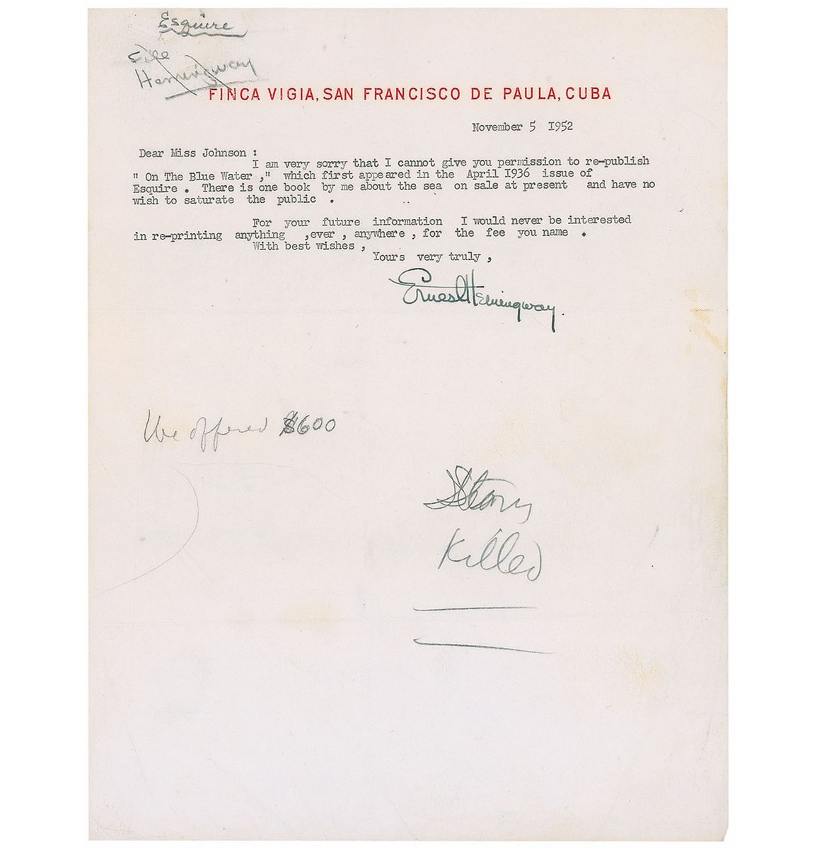 TLS, one onionskin page, 8.5 x 11, Finca Vigia, San Francisco de Paula, Cuba letterhead, November 5, 1952. Hemingway admonishes one Miss Johnson, in full: “I am very sorry that I cannot give you permission to re-publish ‘On the Blue Water,’ which first appeared in the April 1936 issue of Esquire. There is one book by me about the sea on sale at present and I have no wish to saturate the public. For your future information I would never be interested in re-printing anything, ever, anywhere, for the fee you name.” Making note of the author’s succinct decision, details were penciled at the bottom of the page, probably by Miss Johnson, reading: “We offered $600” and “Story Killed.” Then at the top, “Esquire file Hemingway,” was added for filing purposes. In fine condition, with a staple hole to top edge and some scattered light creasing and toning. Hemingway received a request to re-publish an earlier piece, On the Blue Water, just two months after he released the aforementioned novella. Suffice it to say, the writer did not find flattering the appeal, especially given the offered compensation. Understandably, Hemingway was not disposed to reintroducing the world to the unremarkable and unnamed old fisherman from his earlier work, chiefly because his newest champion, Santiago from The Old Man and the Sea, had popularly yielded complimentary recognition. And, as he sought not to “saturate” the public with two tales of the sea, he deemed his recent work more worthy.