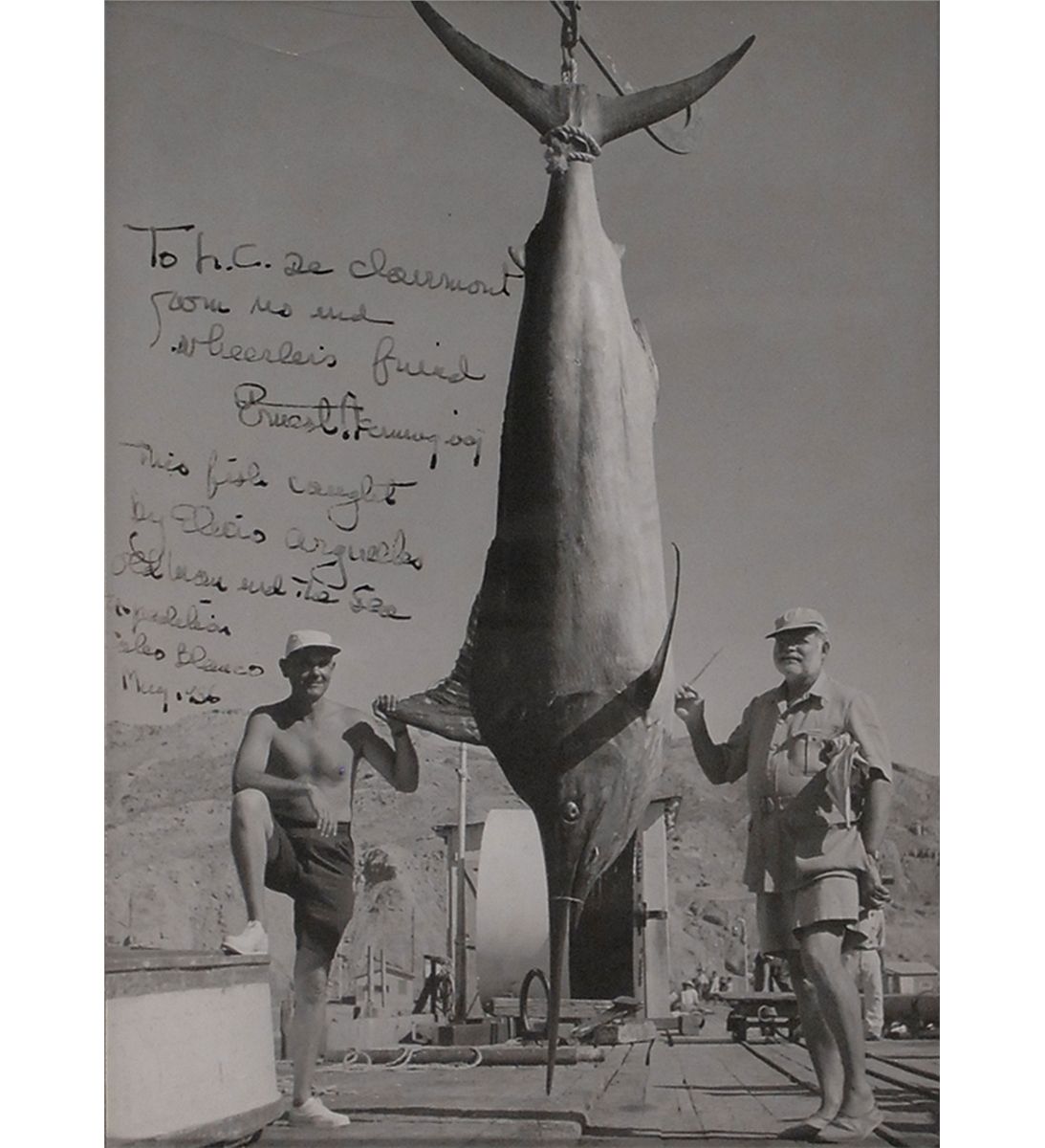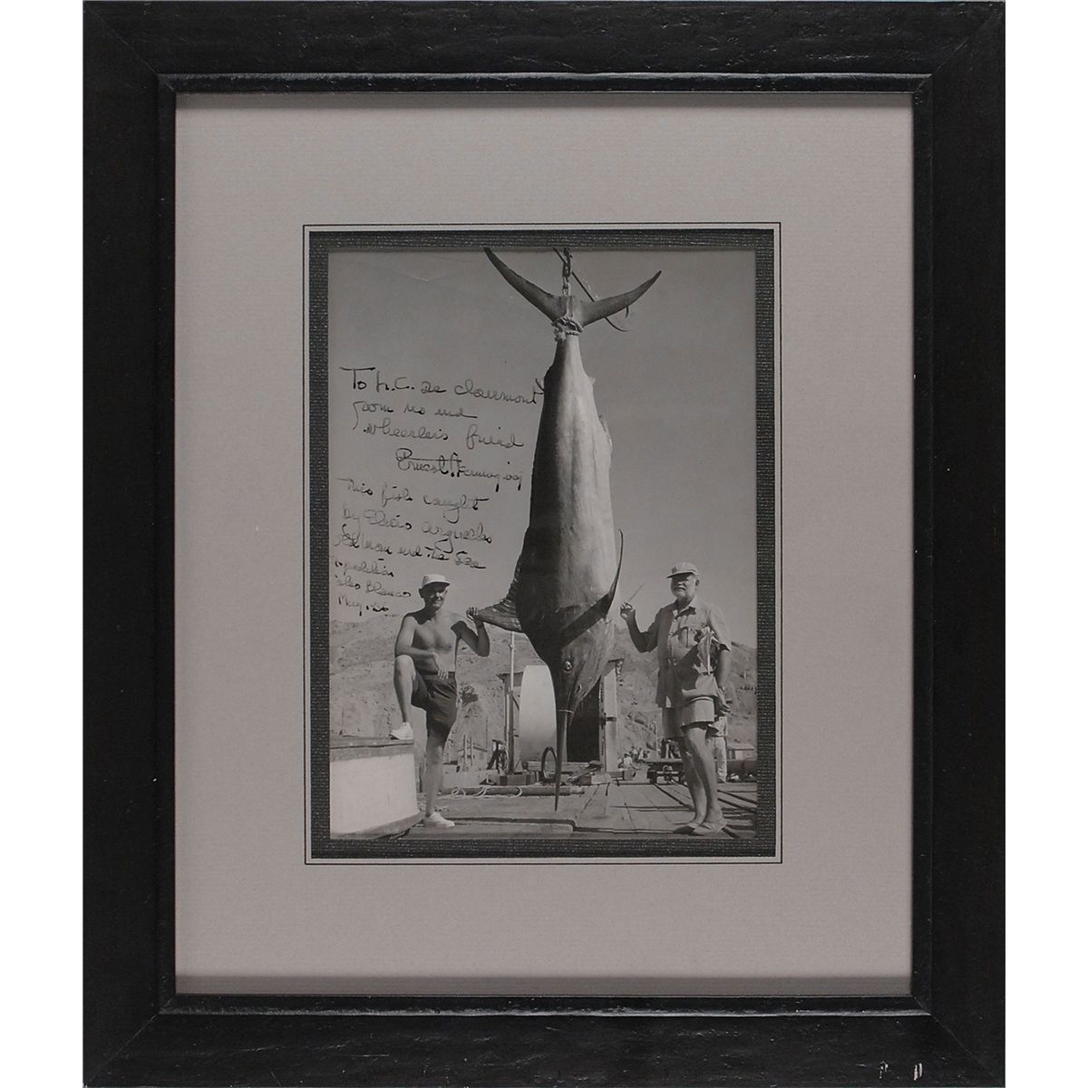 Amazing and visually-striking vintage glossy 6.75 x 9.25 photo of Hemingway and Elicio Arguelles posing alongside a giant marlin, signed and inscribed in fountain pen “To J. C. De Clairmont from his and Wheerler’s friend, Ernest Hemingway. This fish caught by Elicio Arguelles, Old Man and the Sea Expedition, Cabo Blanco, May 1956.” Double-matted and framed to an overall size of 14 x 16.5. Scattered creases, surface marks, and dings, silvering to darker areas of image (visible only at an angle), and portions of Hemingway’s signature and inscription a couple shades light due to decreased ink flow, otherwise very good condition. Just off the northern coast of Peru, Cabo Blanco was known worldwide as Marlin Boulevard for the record-setting fish that filled its waters. It was there that Hemingway spent April and May of 1956 with a film crew from Warner Brothers studios making the movie version of his book, The Old Man and the Sea. Cuban sportsman Elicio Arguelles, who accompanied him on several of his fishing trips for the film, proudly stands next to his catch from one such trip with the great writer at the other side. From Hemingway’s quintessential fisherman pose, to the story-related setting, to the lengthy inscription in his hand labeling the catch as a result of an “Old Man and the Sea Expedition,” this photo is exceptional! Absolutely one of the greatest literary-related photos we have ever seen.