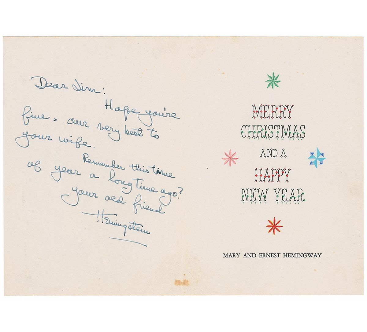 Christmas card sent to his friend Colonel James S. Luckett, featuring a a delightful castle built of presents on the front and a printed Christmas greeting inside, 5.5 x 7.75 closed, signed inside by Hemingway, “Hemingstein.” He also adds an ANS, in full: “Hope you’re fine & our very best to your wife. Remember this time of year a long time ago?” A few small areas of soiling, otherwise fine condition. Accompanied by a photocopy of a letter sent from Hemingway to Luckett while at the Mayo Clinic in 1961. Hemingway and Luckett met in Europe during WWII, and maintained a lifelong friendship.