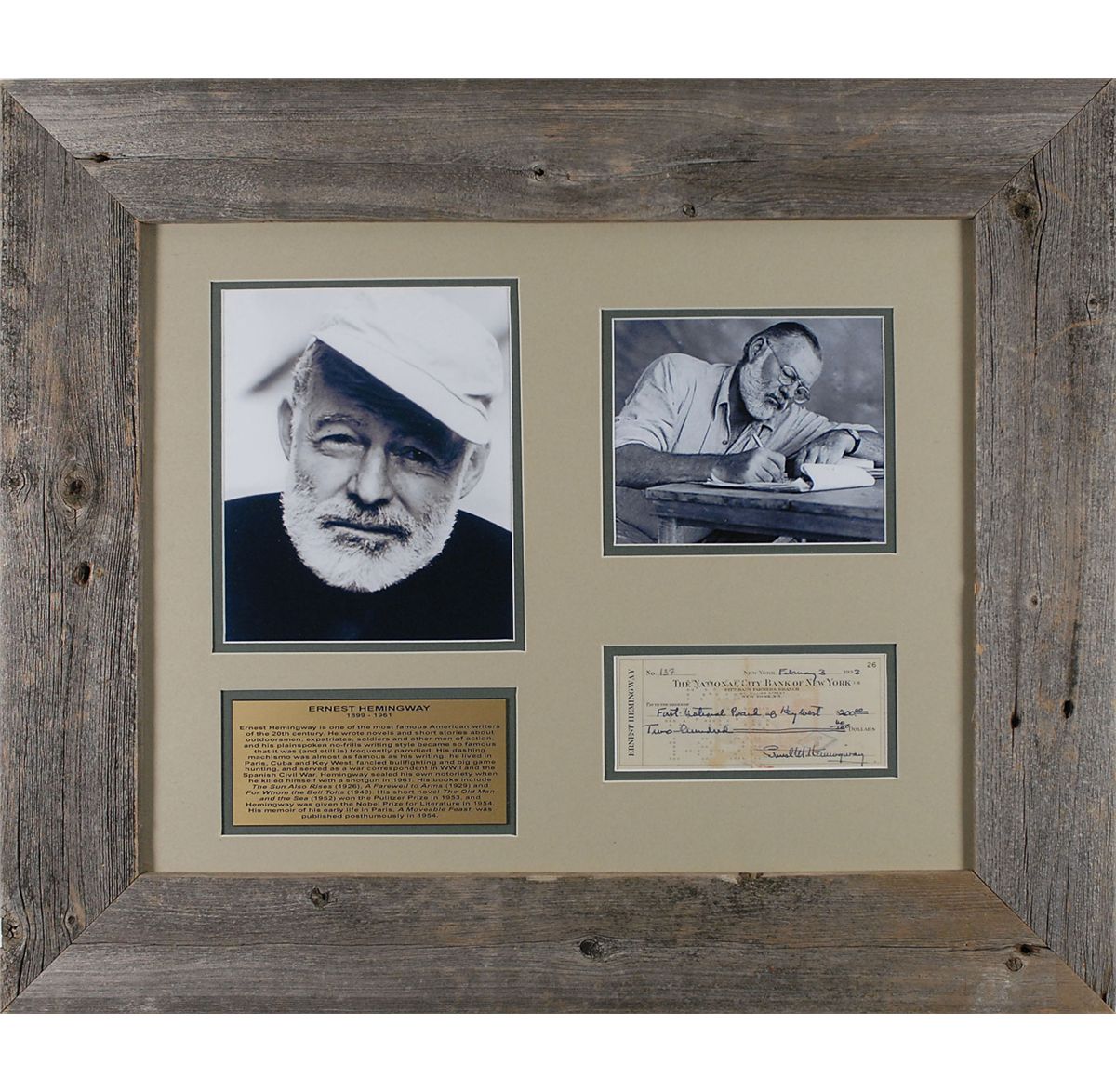 Personal check, 6.25 x 2.75, filled out and signed by Hemingway, “Ernest M. Hemingway,” payable to First National Bank of Key West for $200.00, February 3, 1933. Nicely double-matted and framed in weathered wood with two portraits of Hemingway and a biographical plaque to an overall size of 26.25 x 22.25. In very good condition, with a central vertical fold, expected cancellation holes and stamps, with a couple stamps on both sides lightly affecting small portions of signature. Oversized.